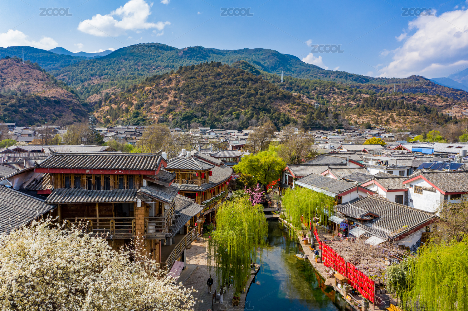 航拍云南麗江束河古鎮(zhèn)茶馬古道集鎮(zhèn)泉源潭水