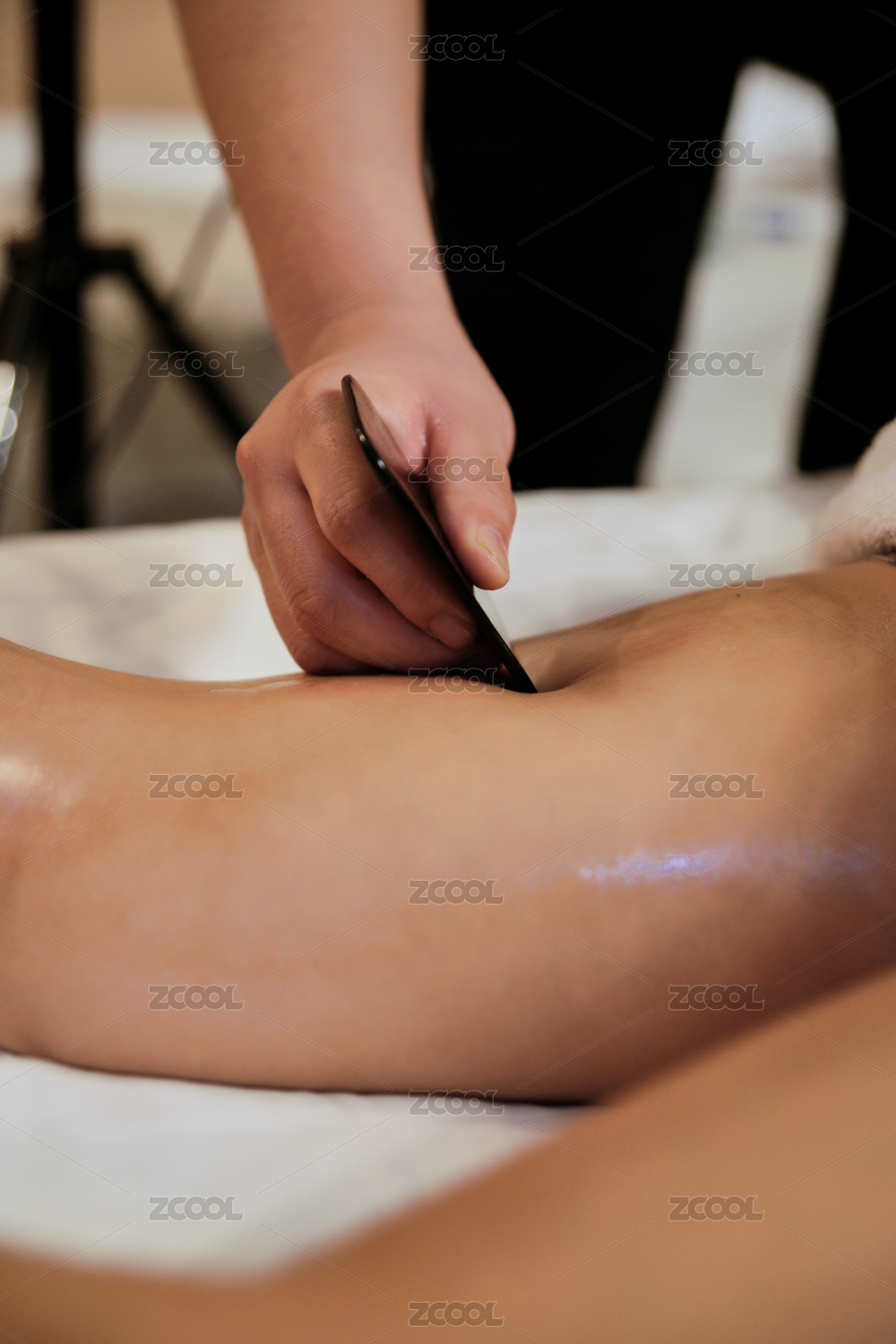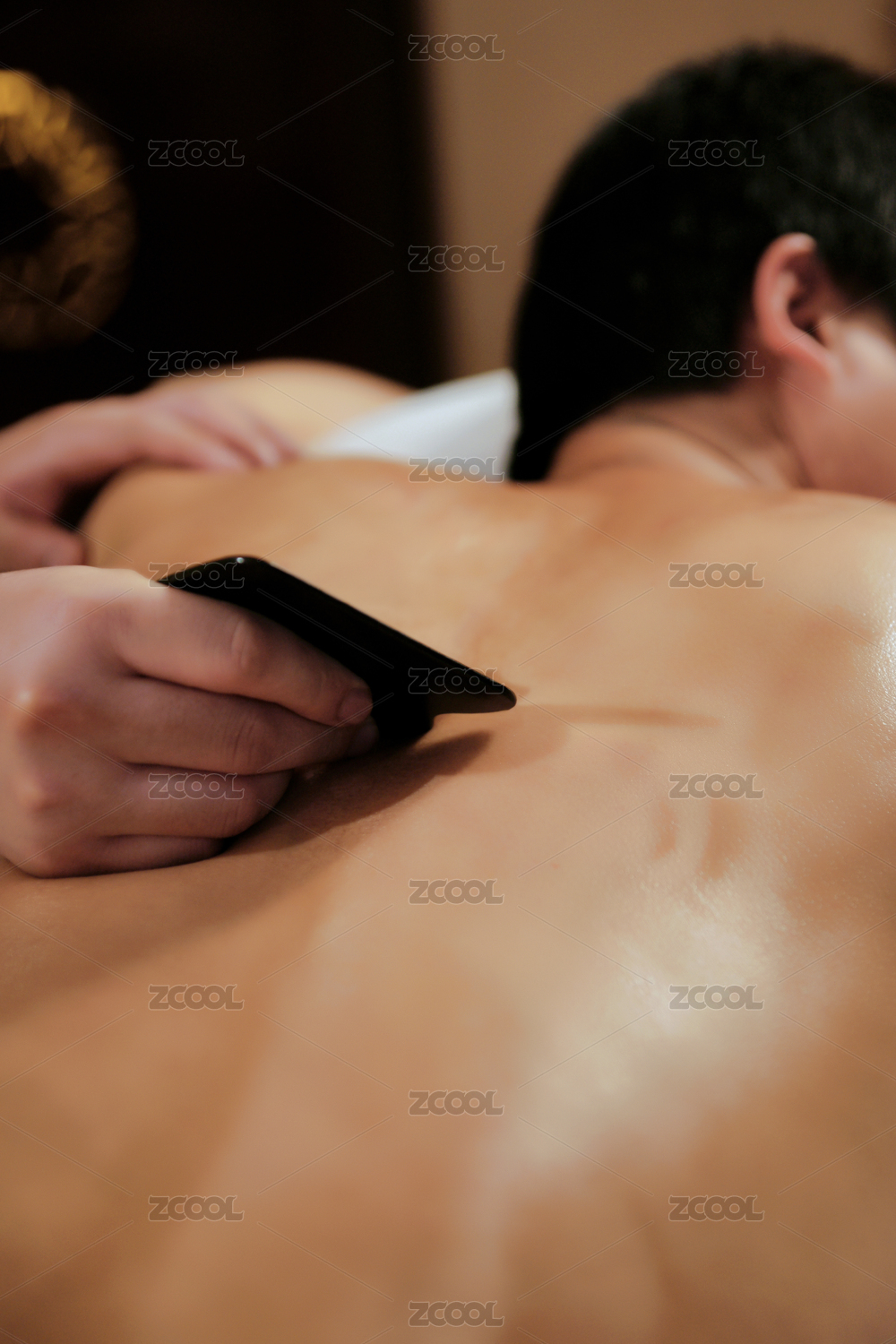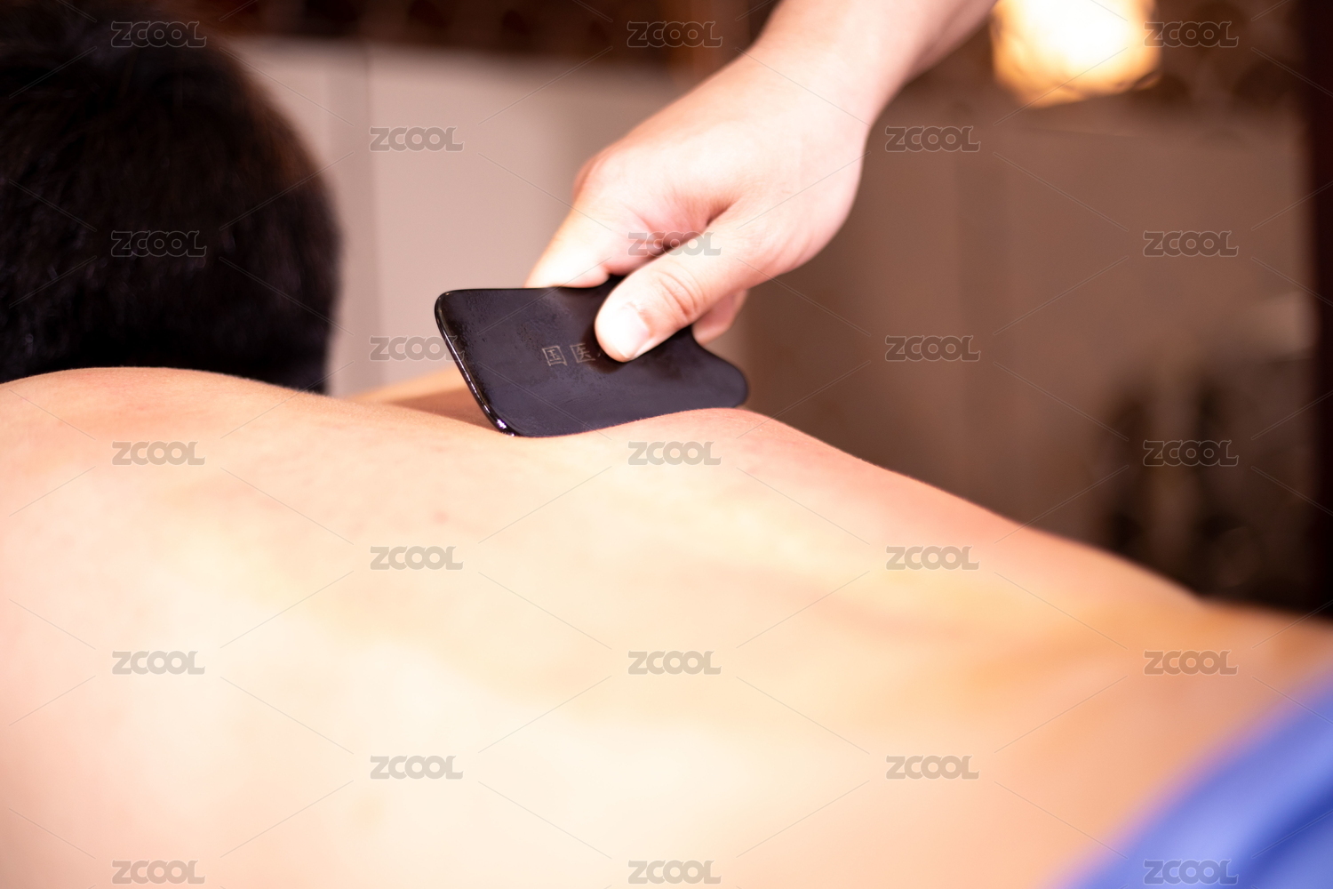 專業(yè)的保健技師為顧客做牛角刮痧
