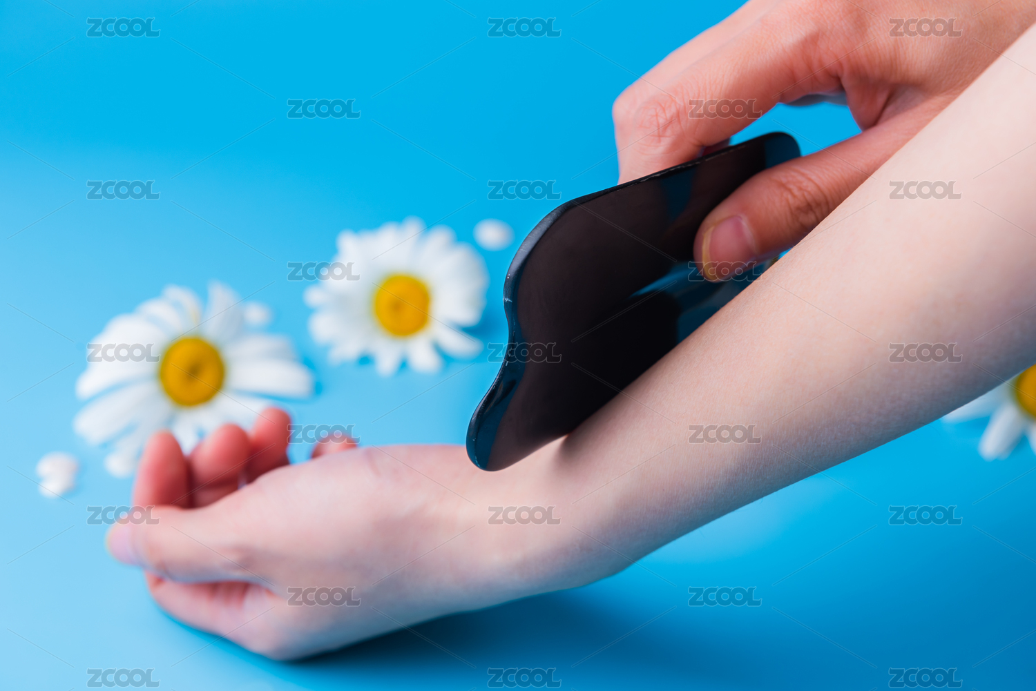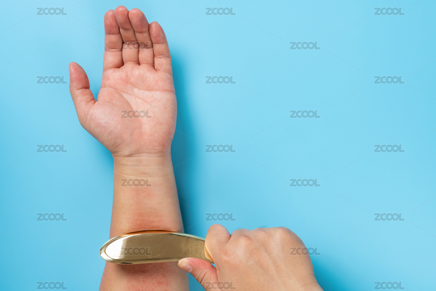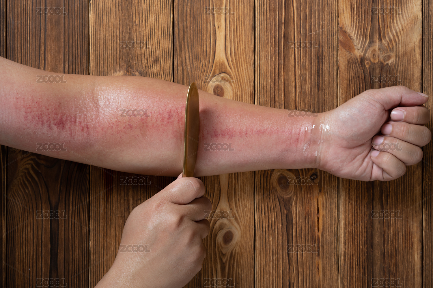 男人給自己的手臂刮痧特寫
