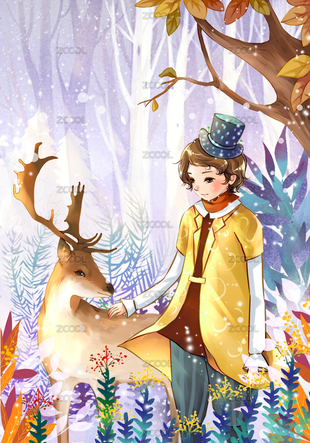 冬日里在紫色森林里和鹿漫步的少年