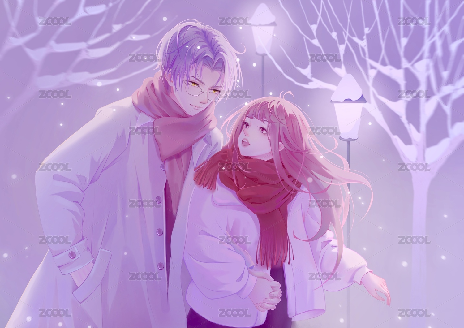 男孩女孩在下雪的夜晚牽手漫步