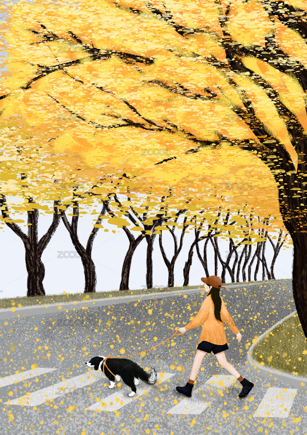 秋日女孩與狗漫步林蔭道