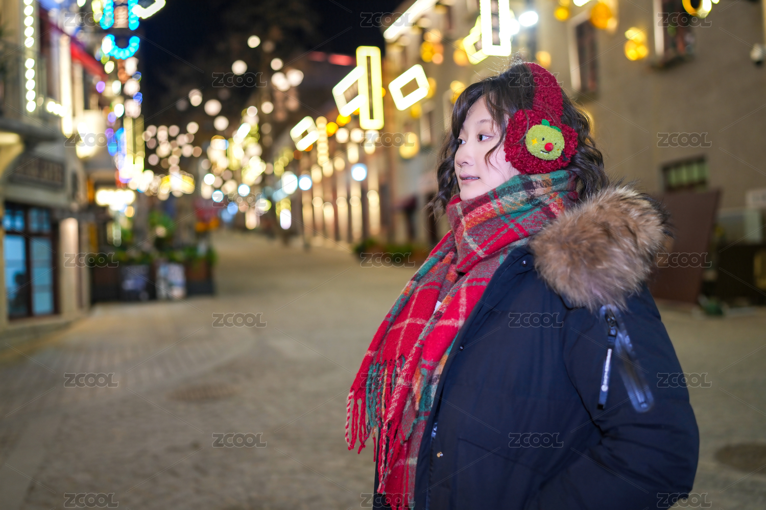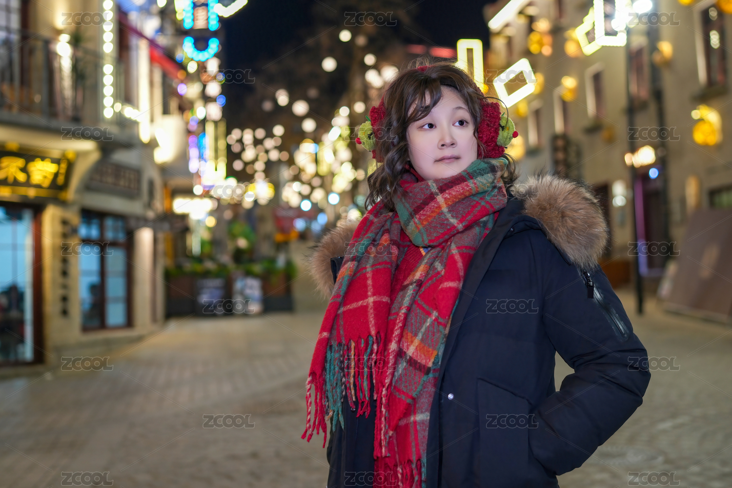 節(jié)日燈光和舒適時(shí)尚的迷人冬夜漫步的女性