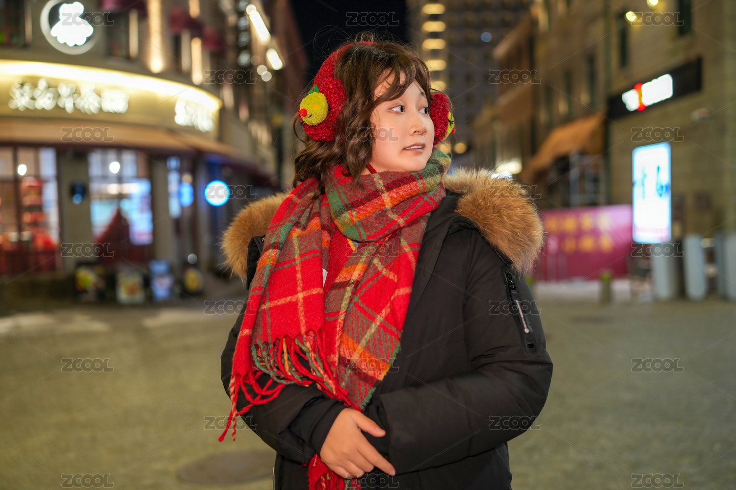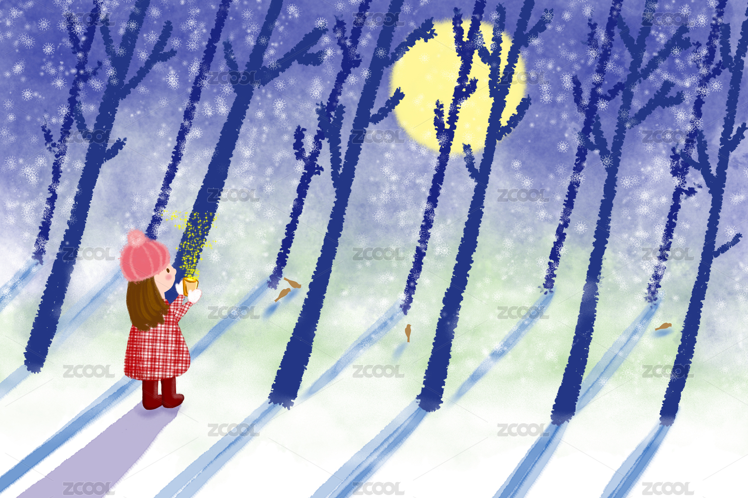 初雪的夜晚一個(gè)穿紅格子衣的小女孩手捧著奶茶在樹林里漫步