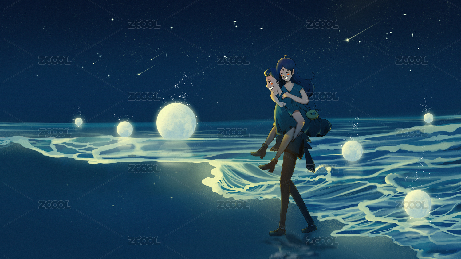 星空下男孩背著女孩在海邊漫步唯美手繪插畫