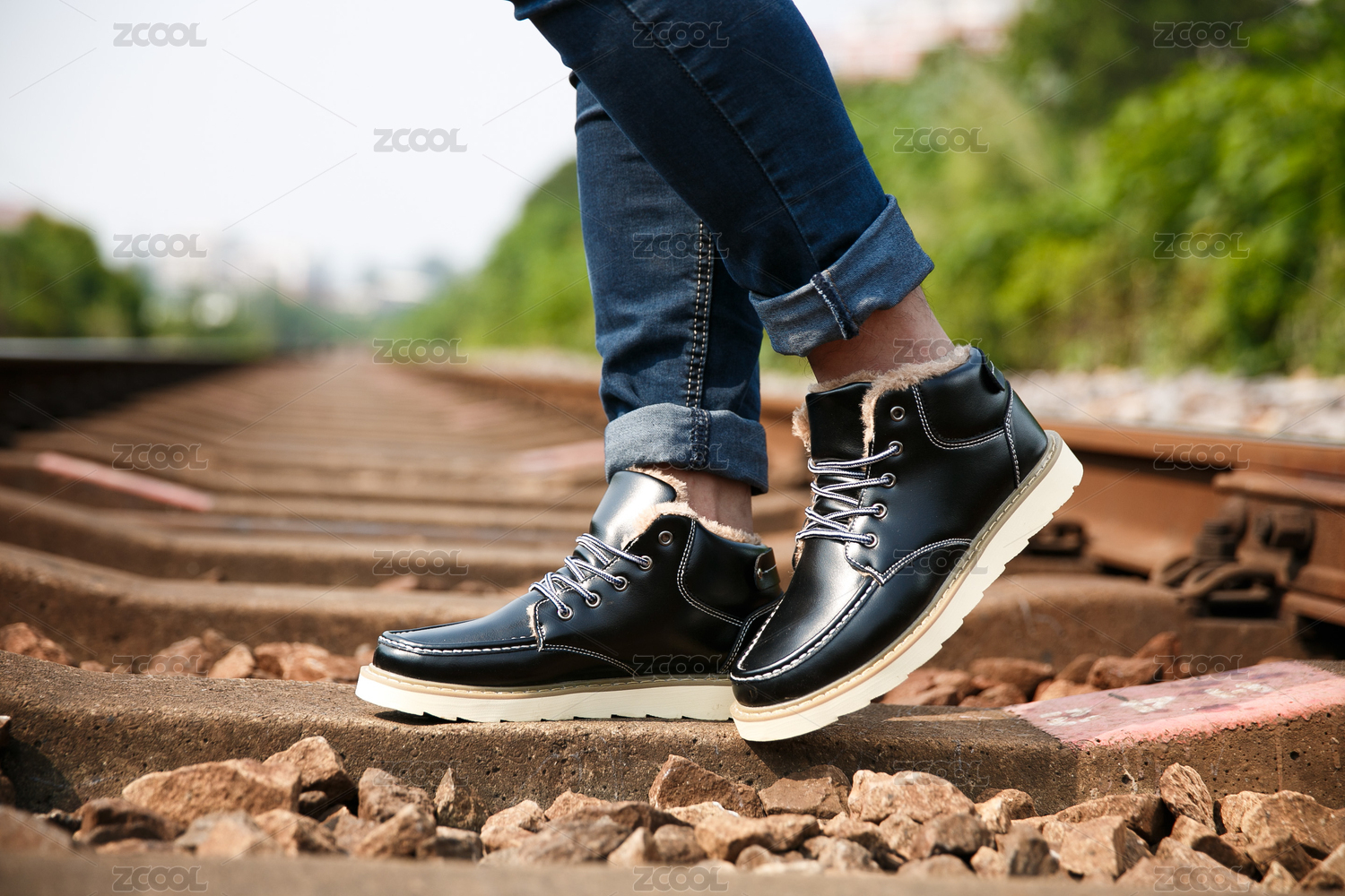 穿著保暖的黑色皮鞋漫步在鐵路軌道上