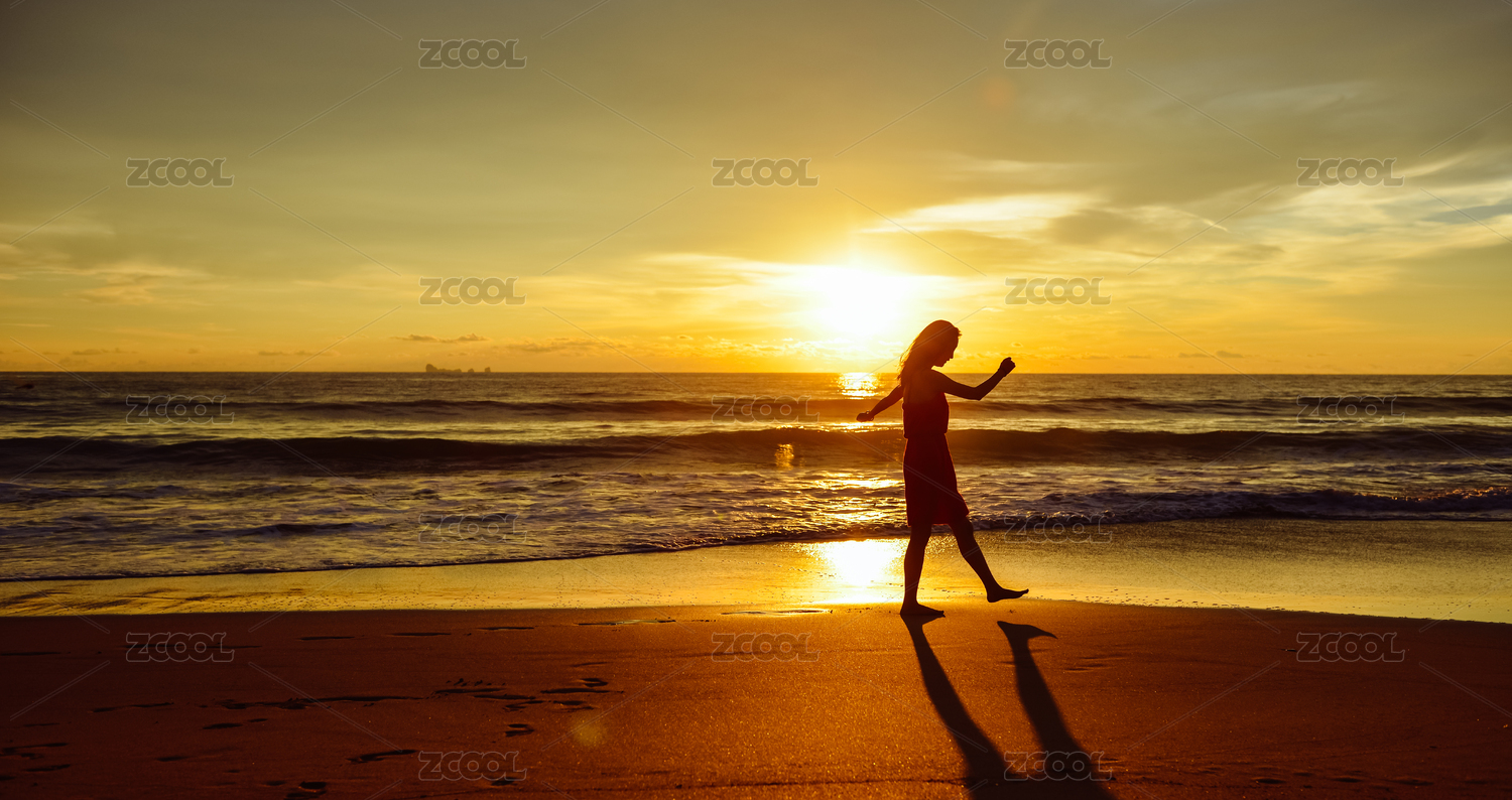 一位年輕女性在日落時(shí)漫步在泰國(guó)甲米的蘭達(dá)島的海灘上的剪影