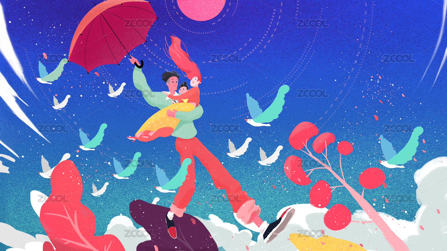 巨大的父親舉著雨傘抱著妻子兒子在空中漫步(扁平風(fēng)格插畫)
