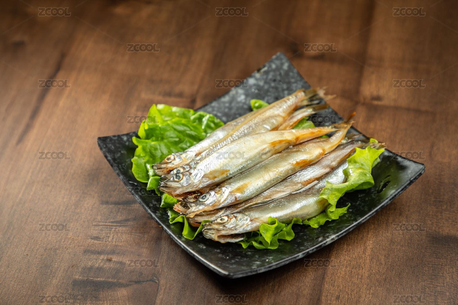 棕色木紋桌上放著一盤多春魚