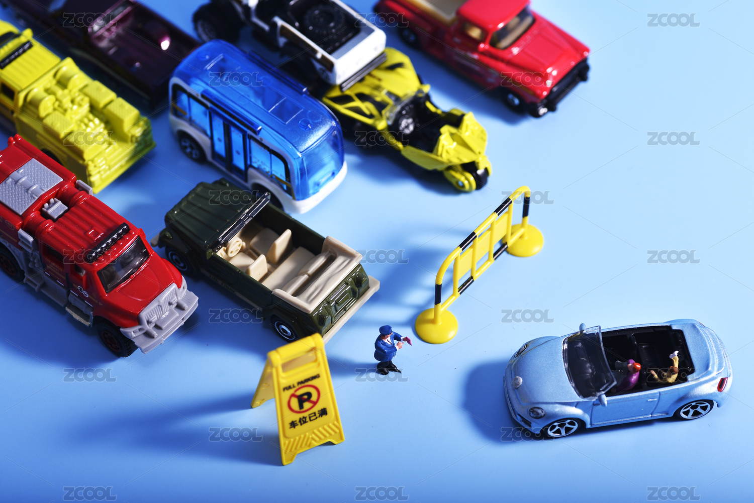 藍(lán)色背景上的微縮小汽車和小人偶停車難主題