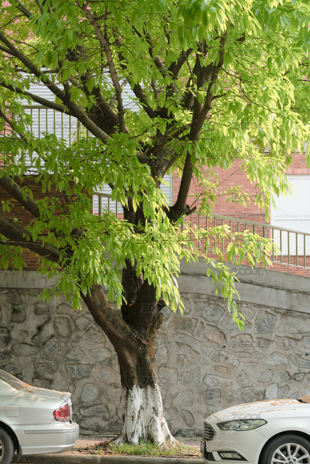 街道邊的大樹(shù)和停著的汽車