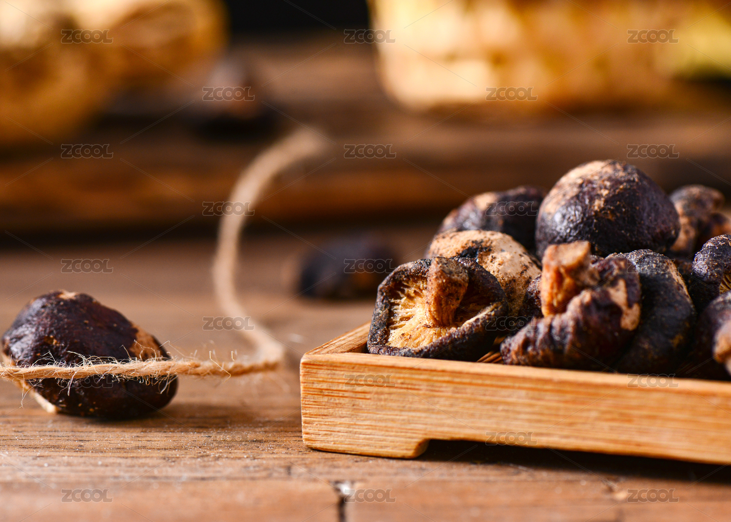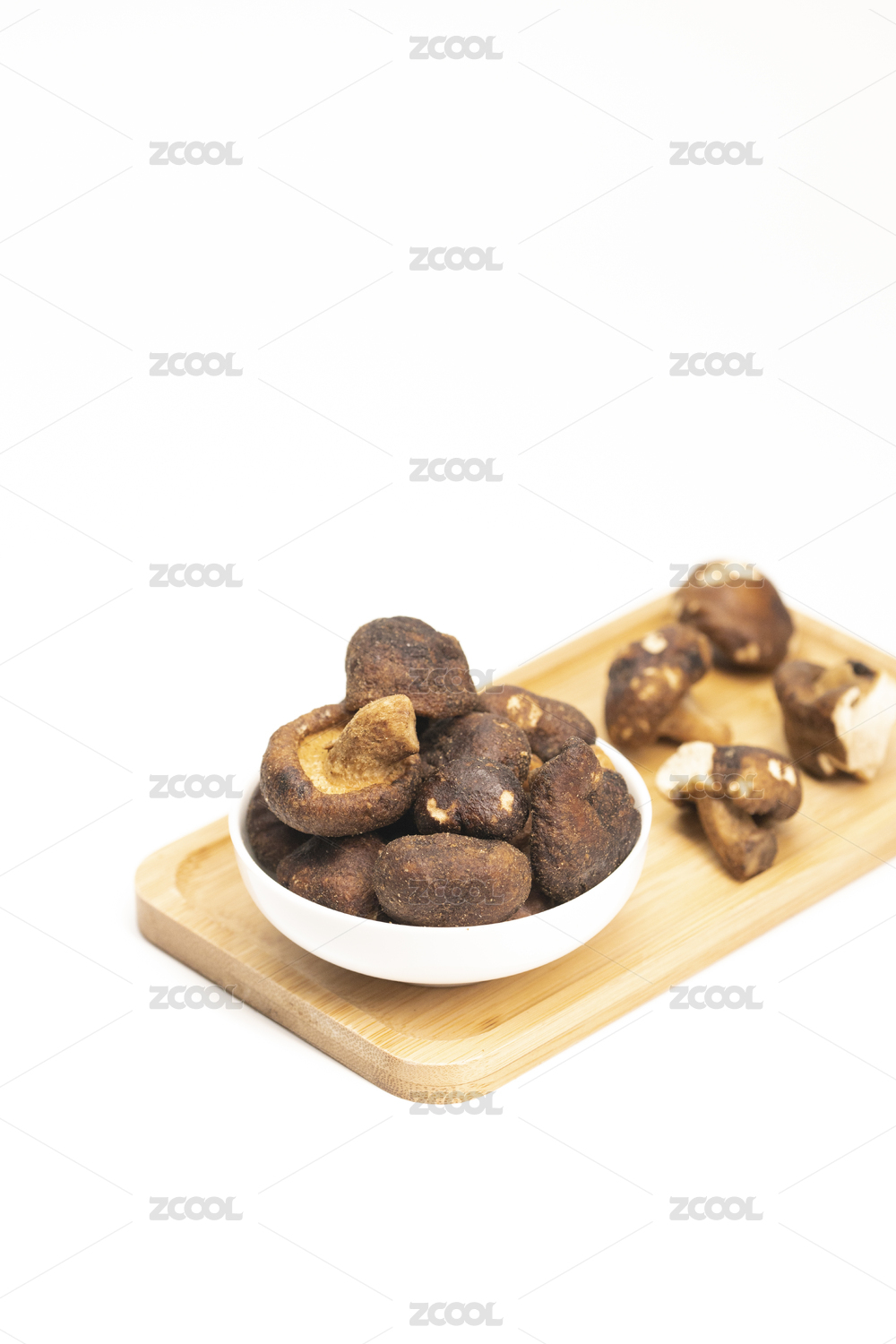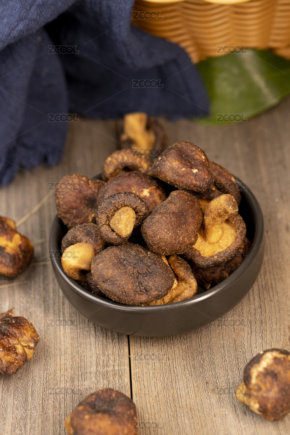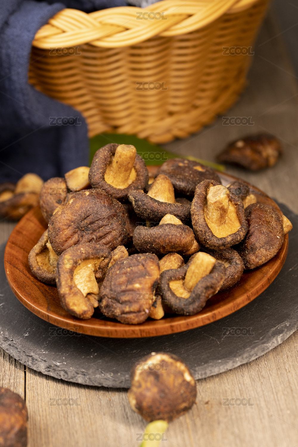 木色背景上擺放的蔬菜干香菇脆