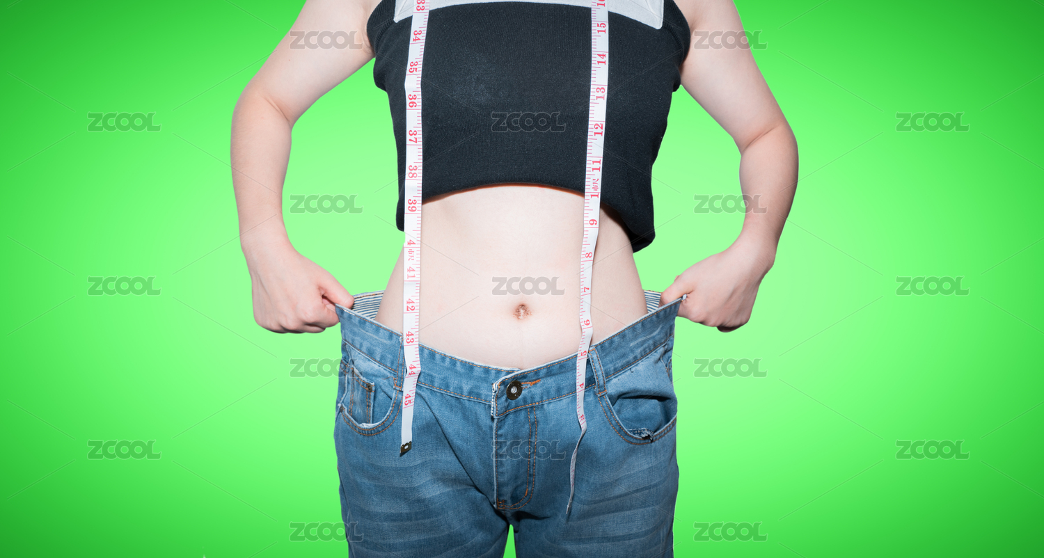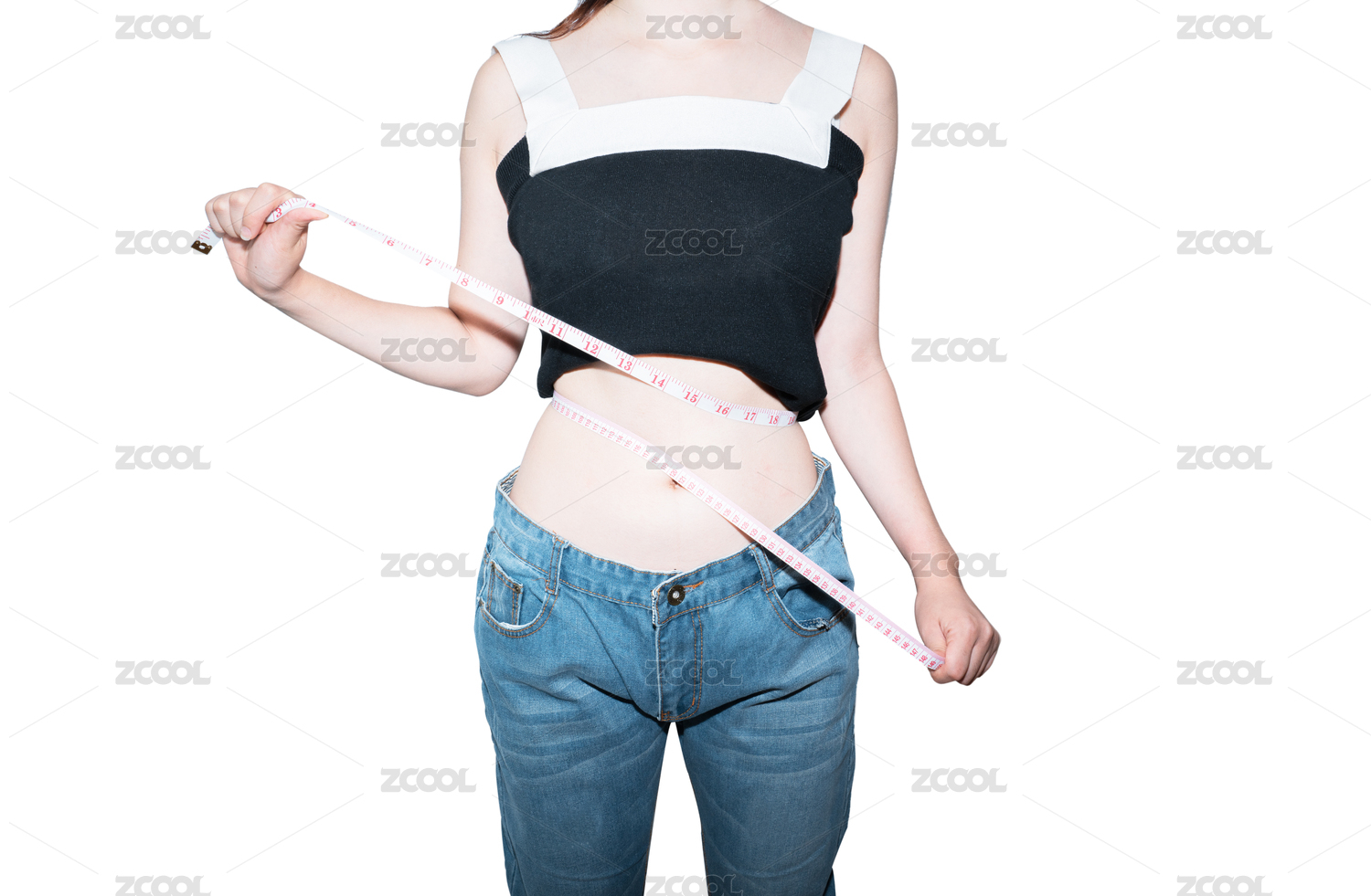 美女手拿著皮尺卷尺寬松的牛仔褲減肥減脂件腹瘦腰細(xì)腰概念