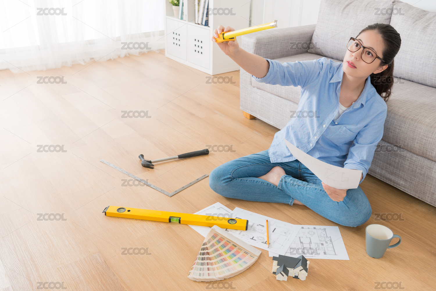 認(rèn)真漂亮主婦坐在客廳的木地板控股工程師帶標(biāo)尺工具測量房子內(nèi)部恢復(fù)與高角度來看照片的設(shè)計(jì)。