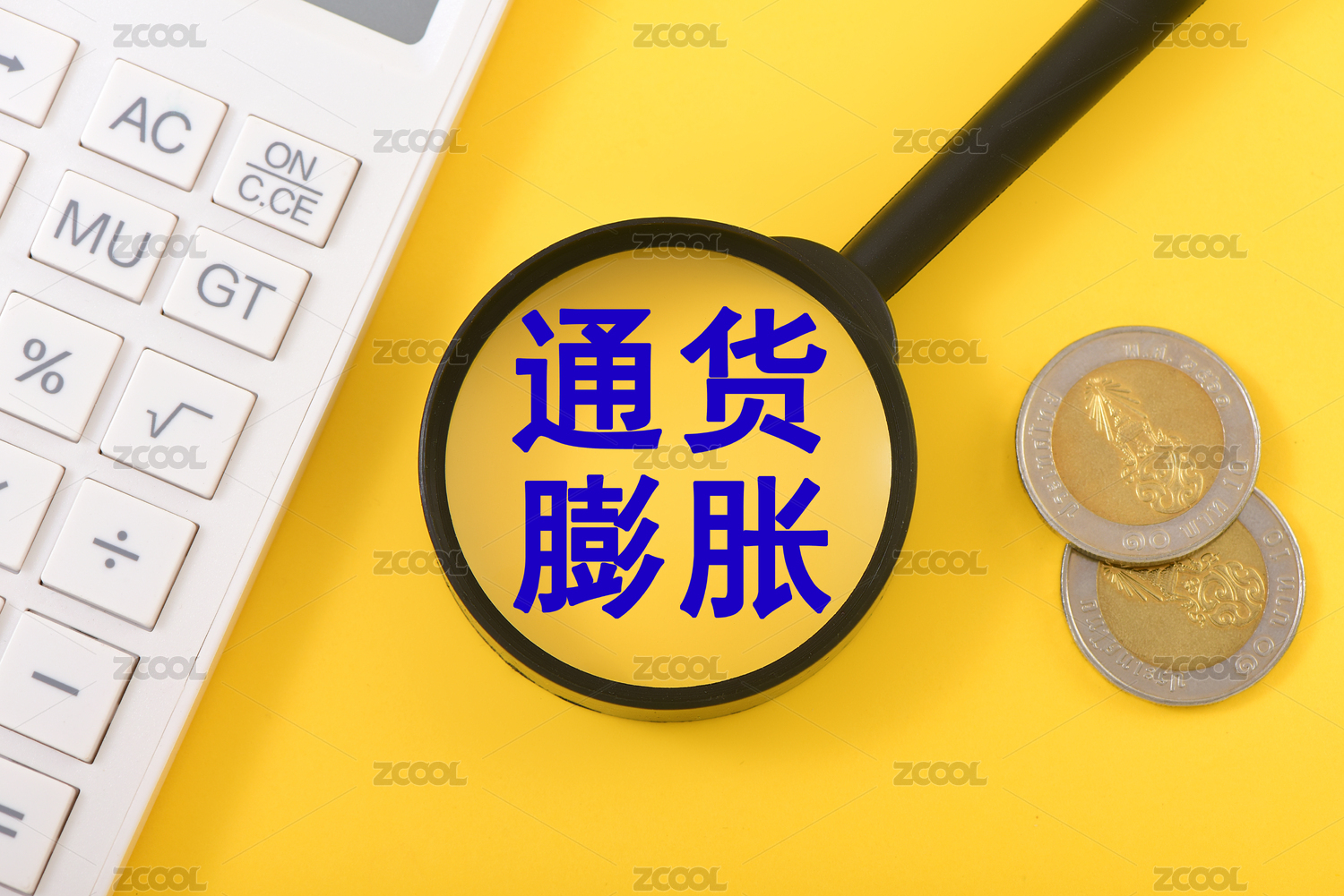 金融辦公用品上的放大鏡印著文字通貨膨脹