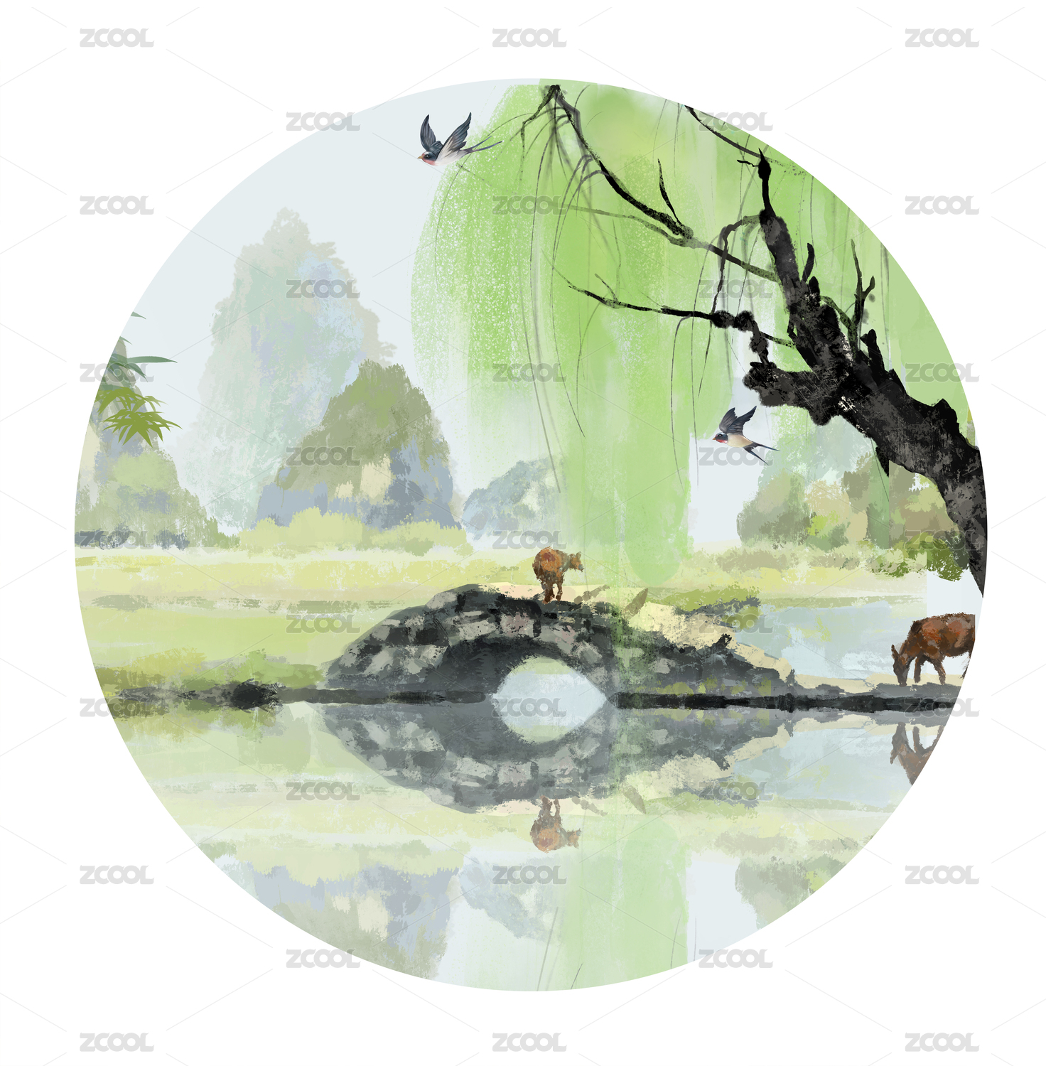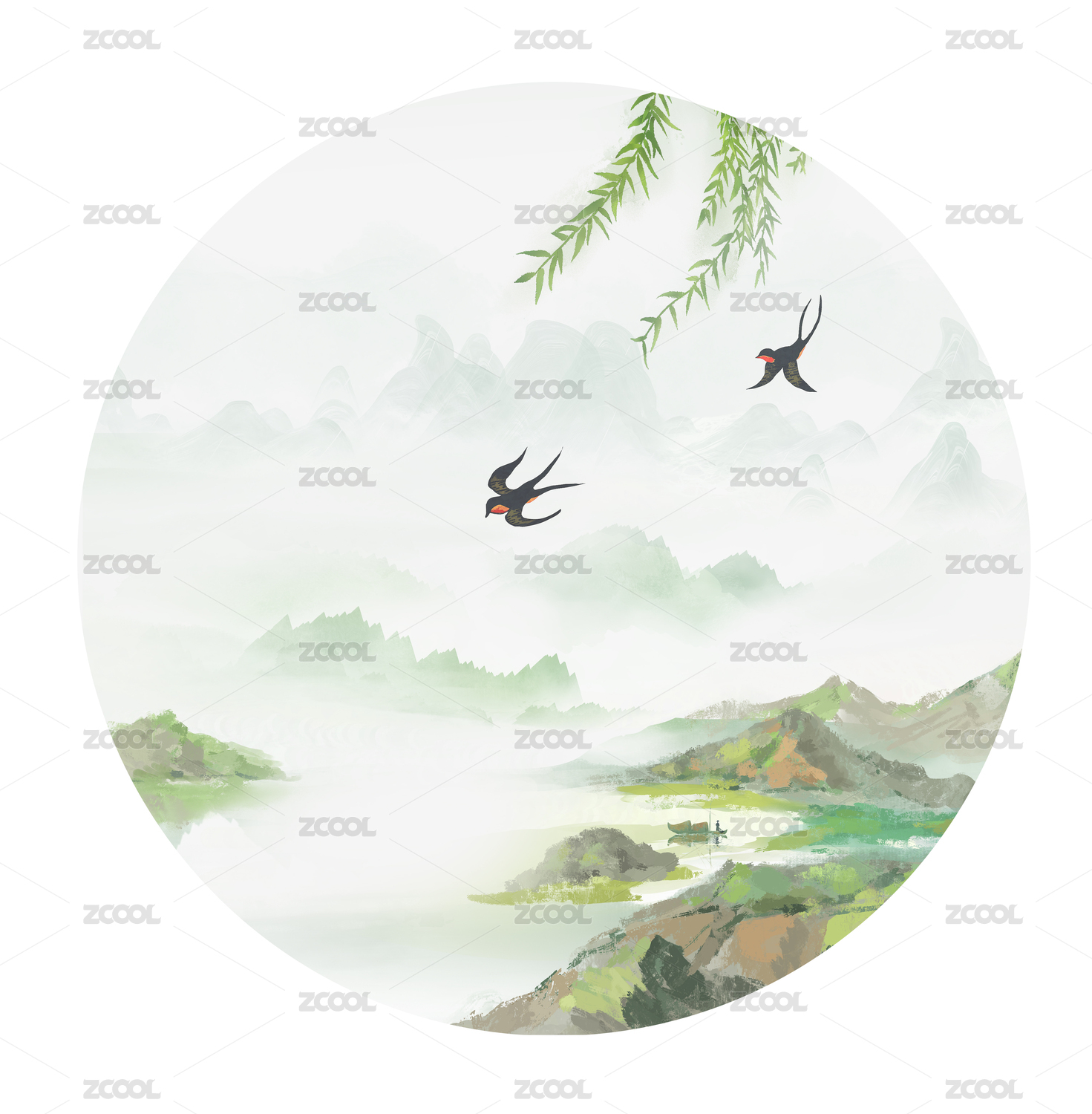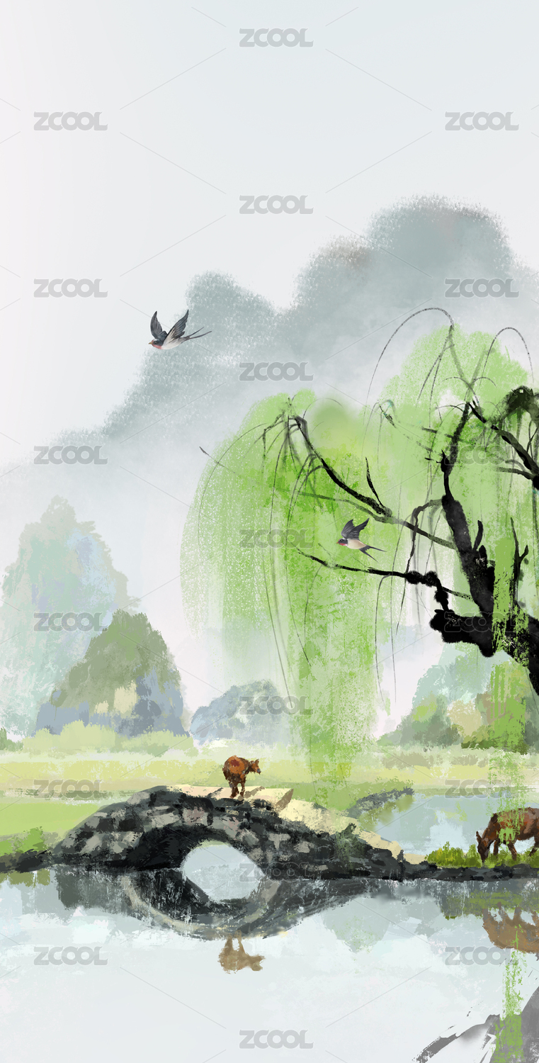 中國風春分清明插畫水墨山水背景插畫