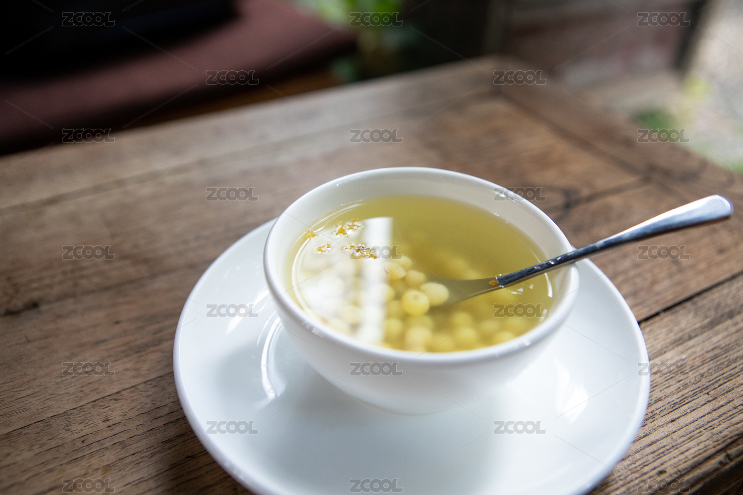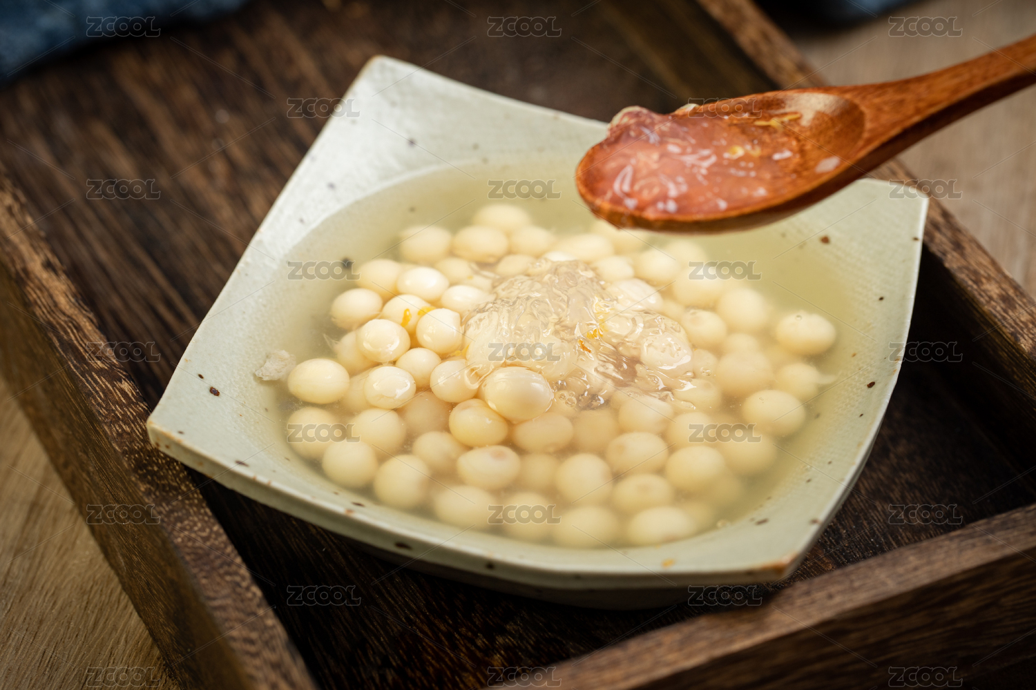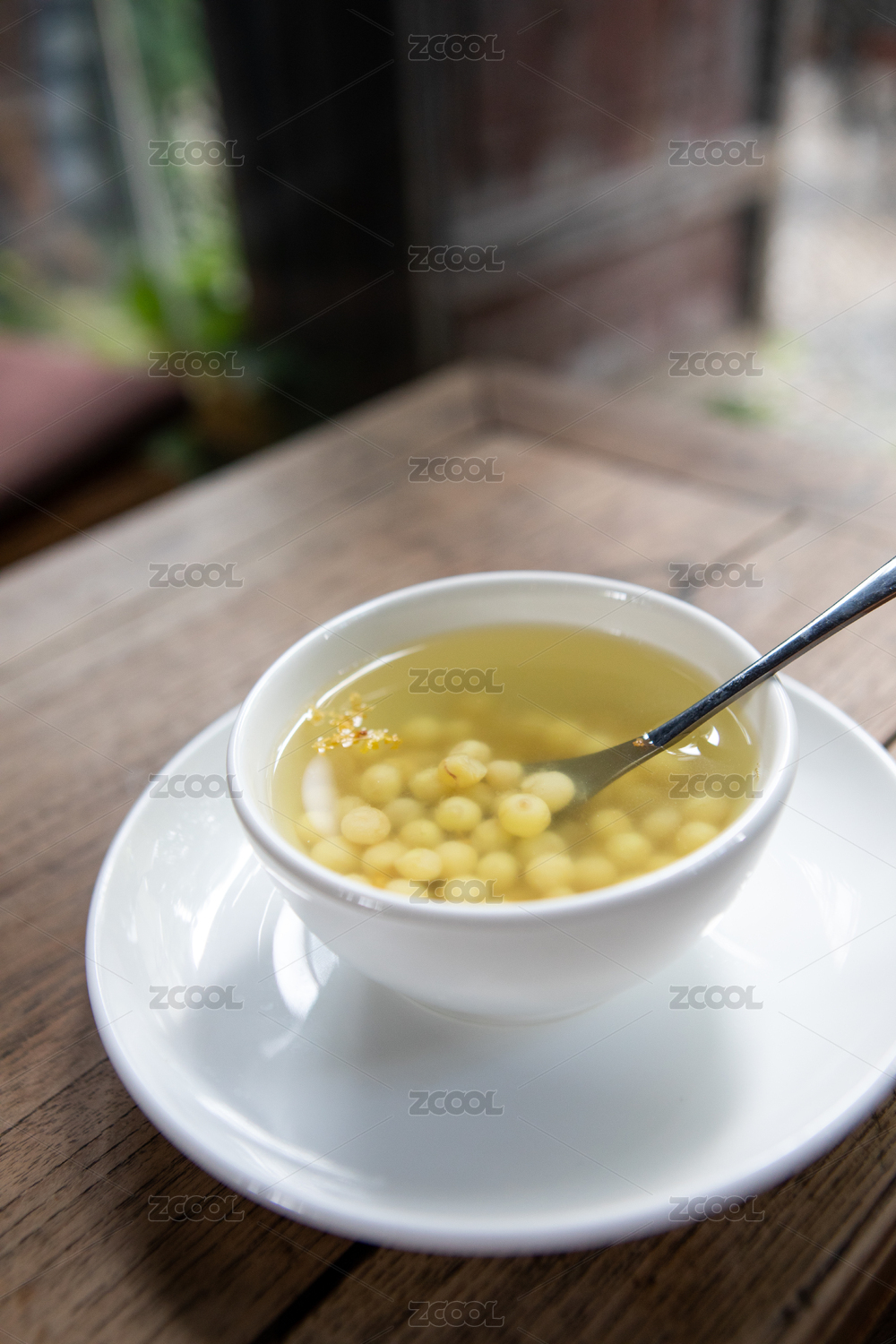 放在實木桌子上的,白色碗里裝著桂花雞頭米糖水