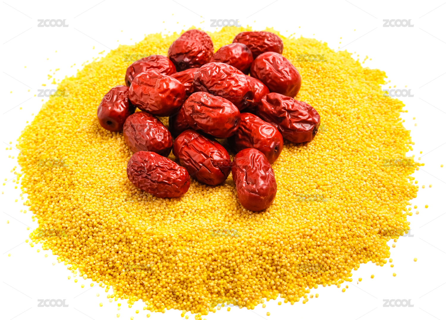 白底鋪滿紅棗小黃米上的五谷背景素材