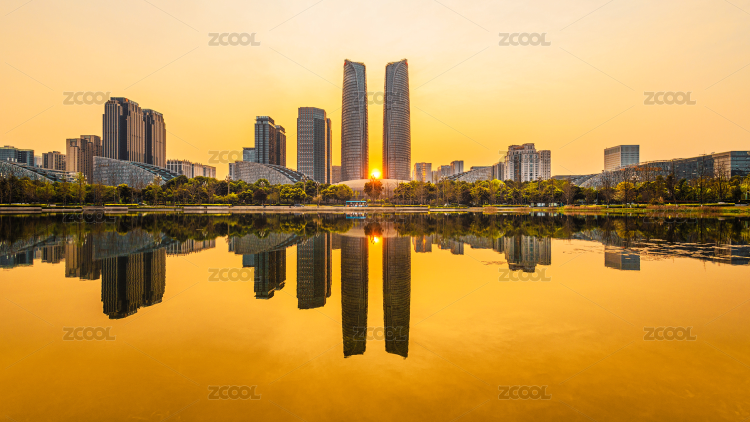 四川成都天府新區(qū)金融城晚霞落日倒影