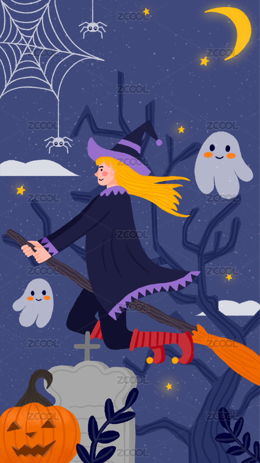 女孩騎掃把飛行萬圣節(jié)插畫啟動頁彈窗
