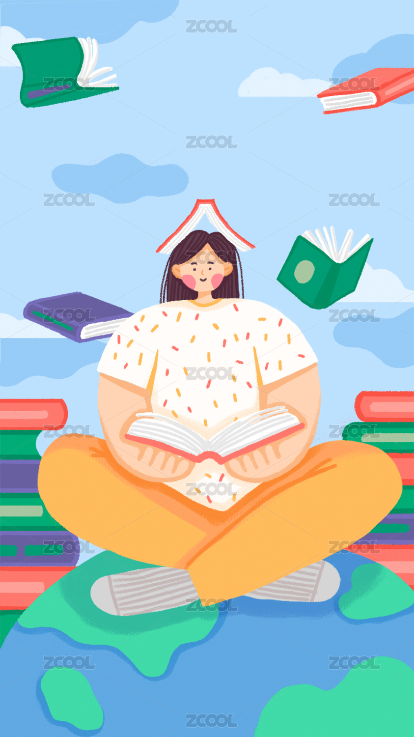 世界讀書日女孩頭頂書坐讀書插畫啟動頁彈窗