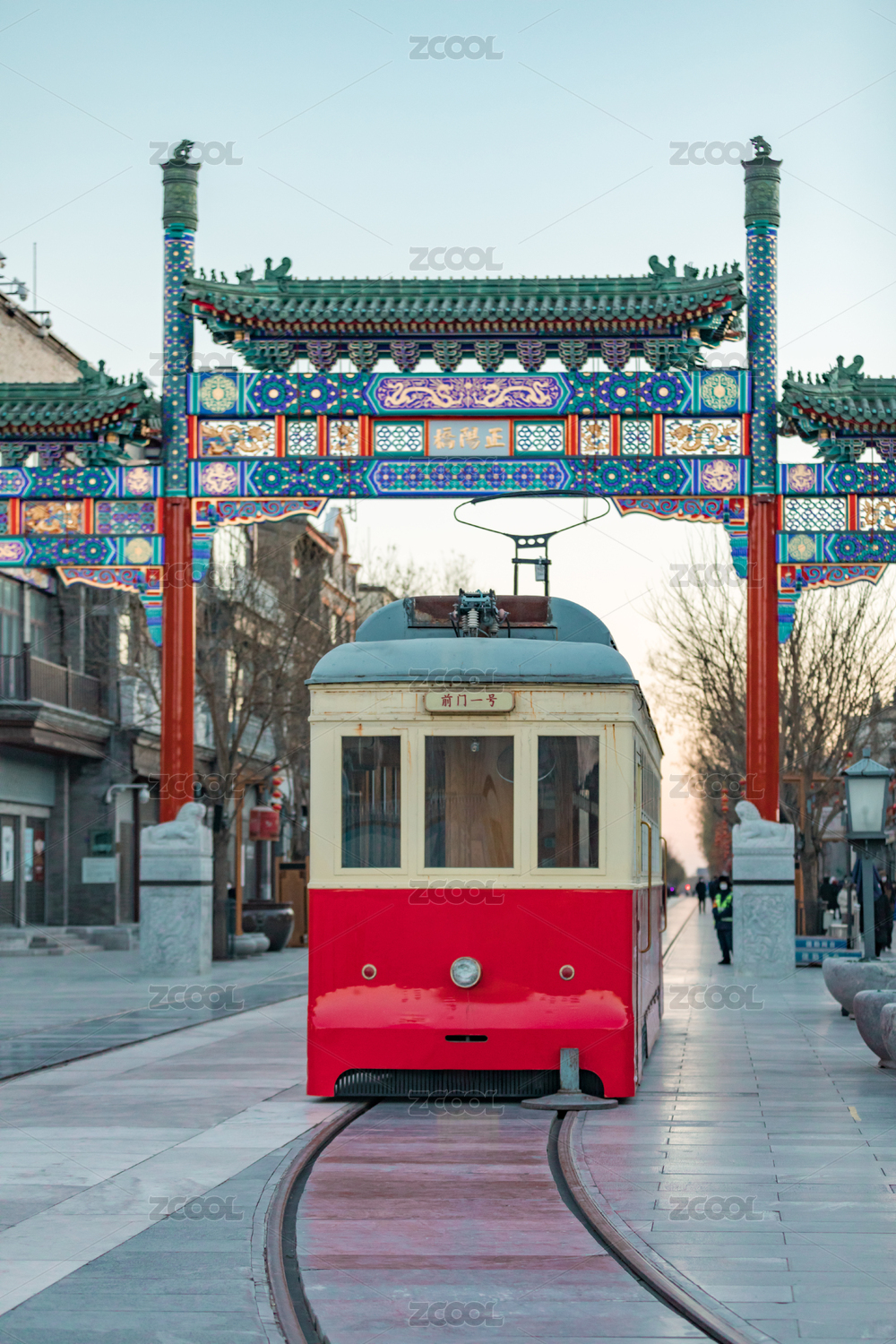 北京前門(mén)正陽(yáng)橋牌樓下的紅色鐺鐺車