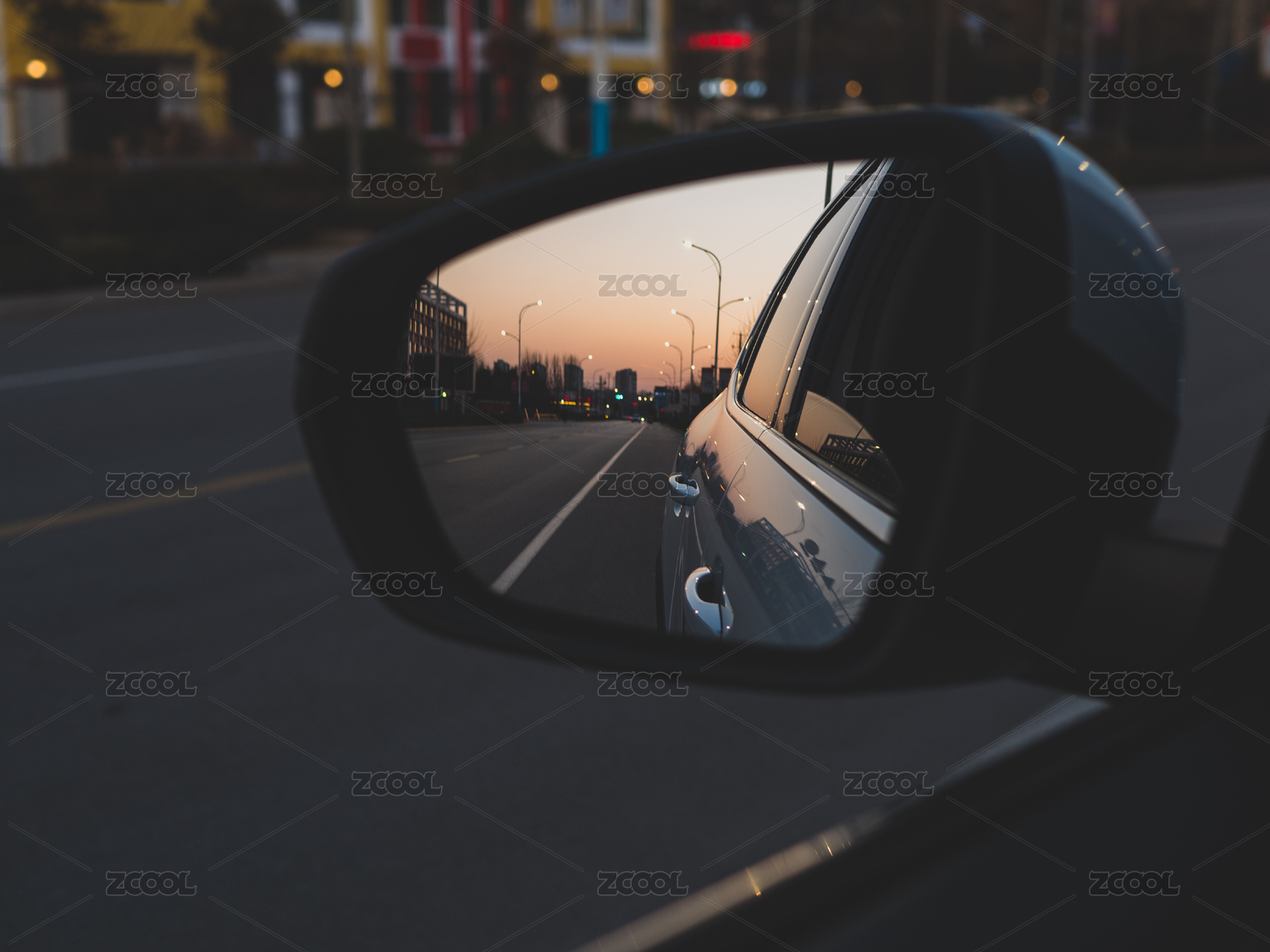 透過后視鏡看到天空的晚霞
