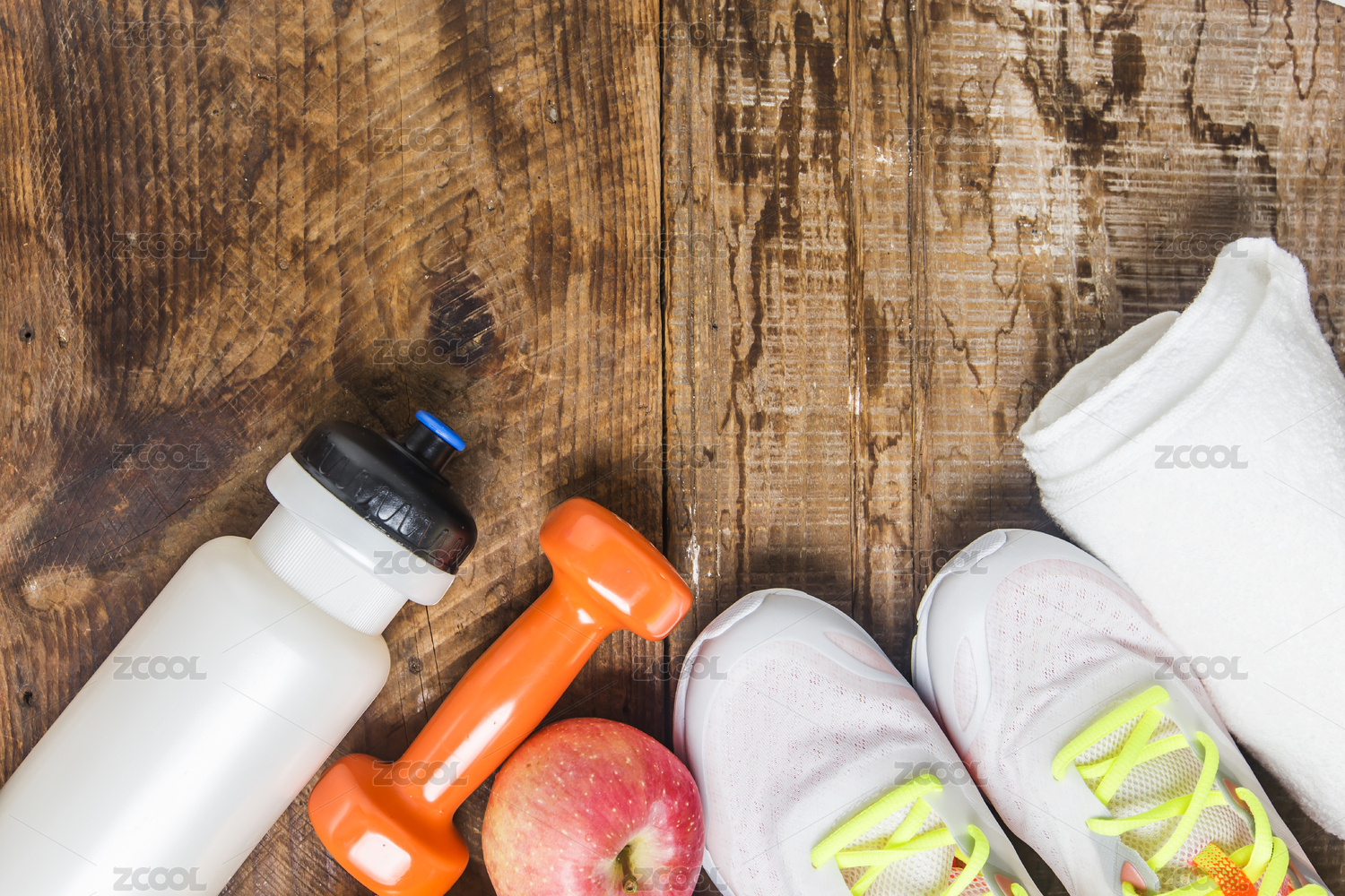 正上方視角藍(lán)色背景特寫一雙跑鞋,跳繩,手機(jī),耳機(jī)和運(yùn)動(dòng)水壺