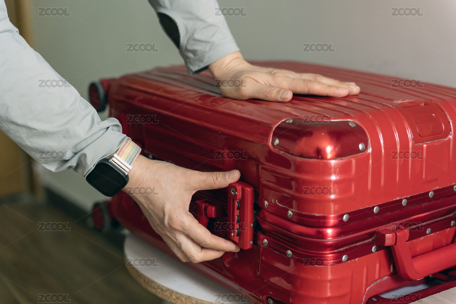 人調(diào)整紅色行李箱鎖扣