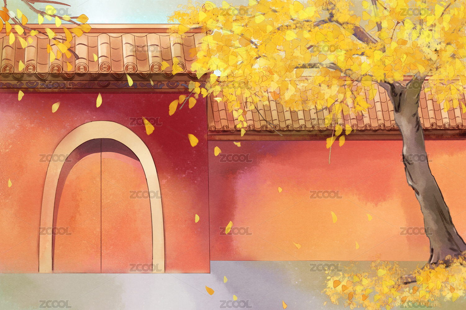 中國(guó)風(fēng)二十四節(jié)氣插畫秋天的宮墻銀杏樹