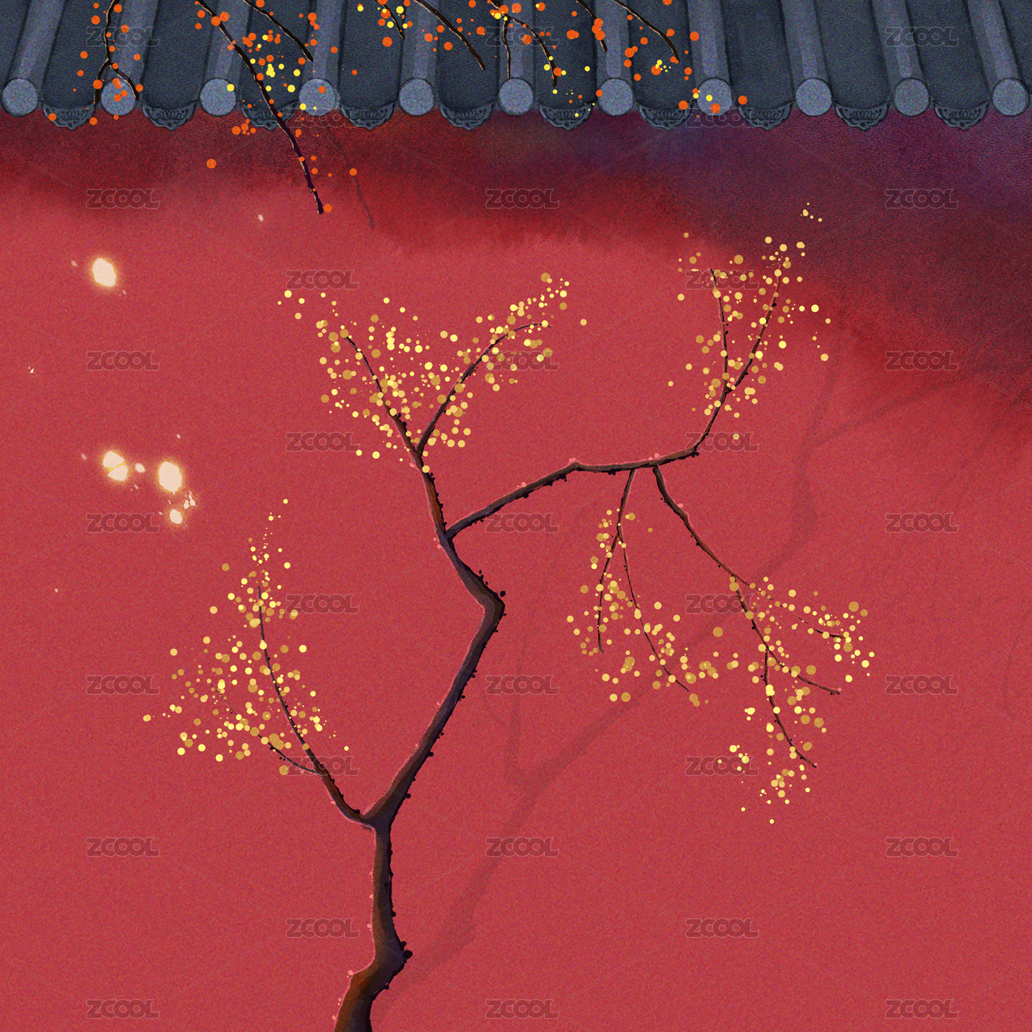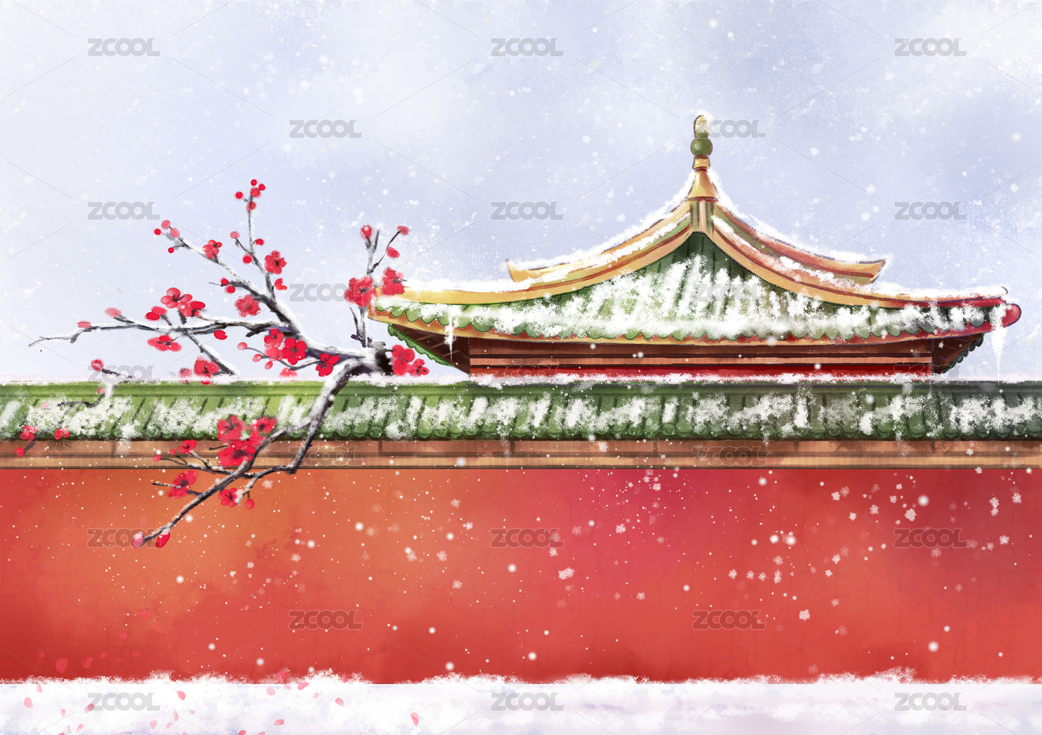 手繪中國(guó)風(fēng)大雪宮墻紅梅