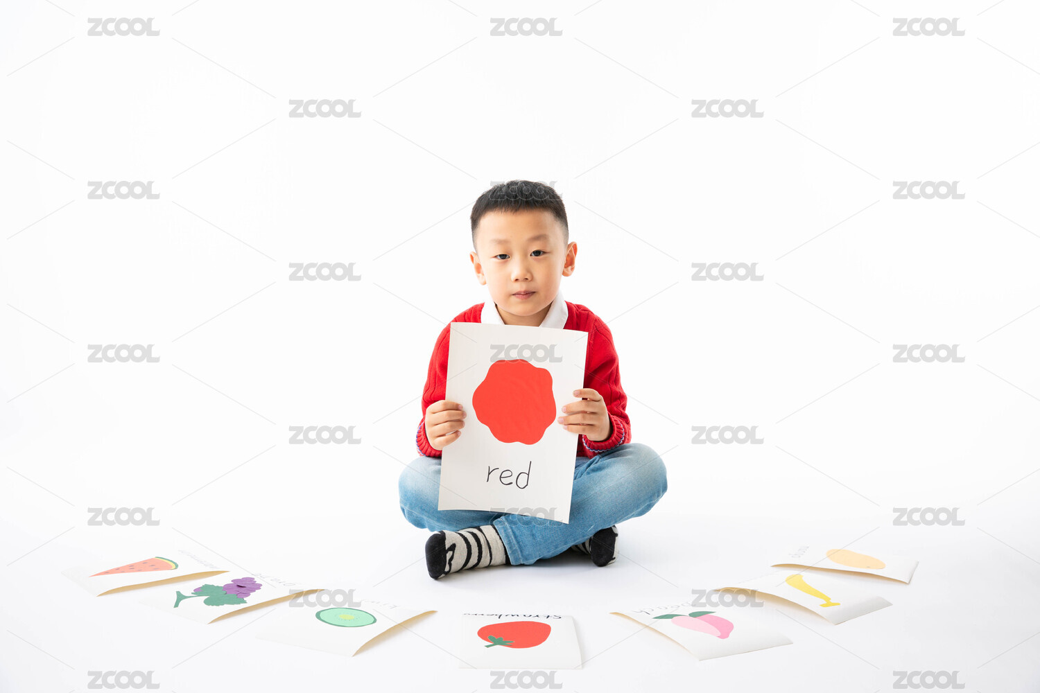 室內白色背景男孩拿著英語卡片學英語