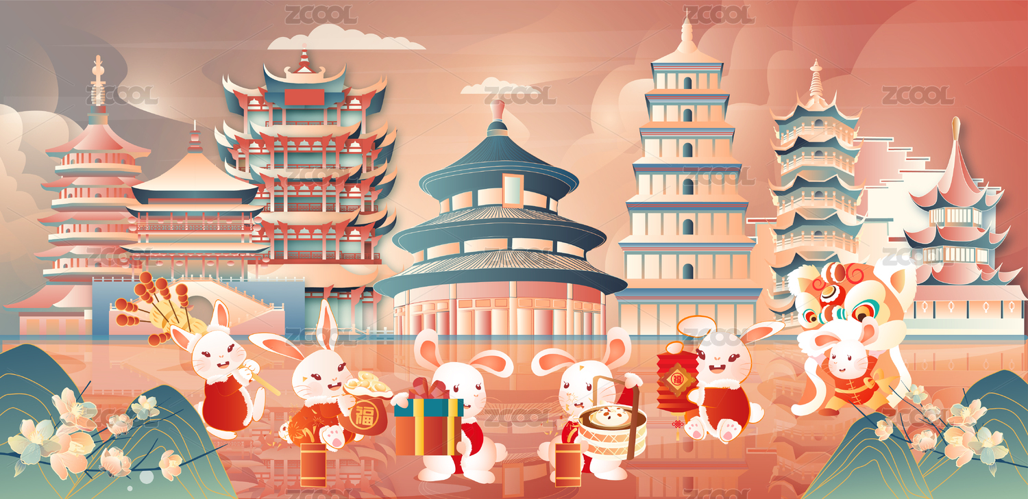 春節(jié)全國古建筑國風(fēng)年俗橫版矢量插畫