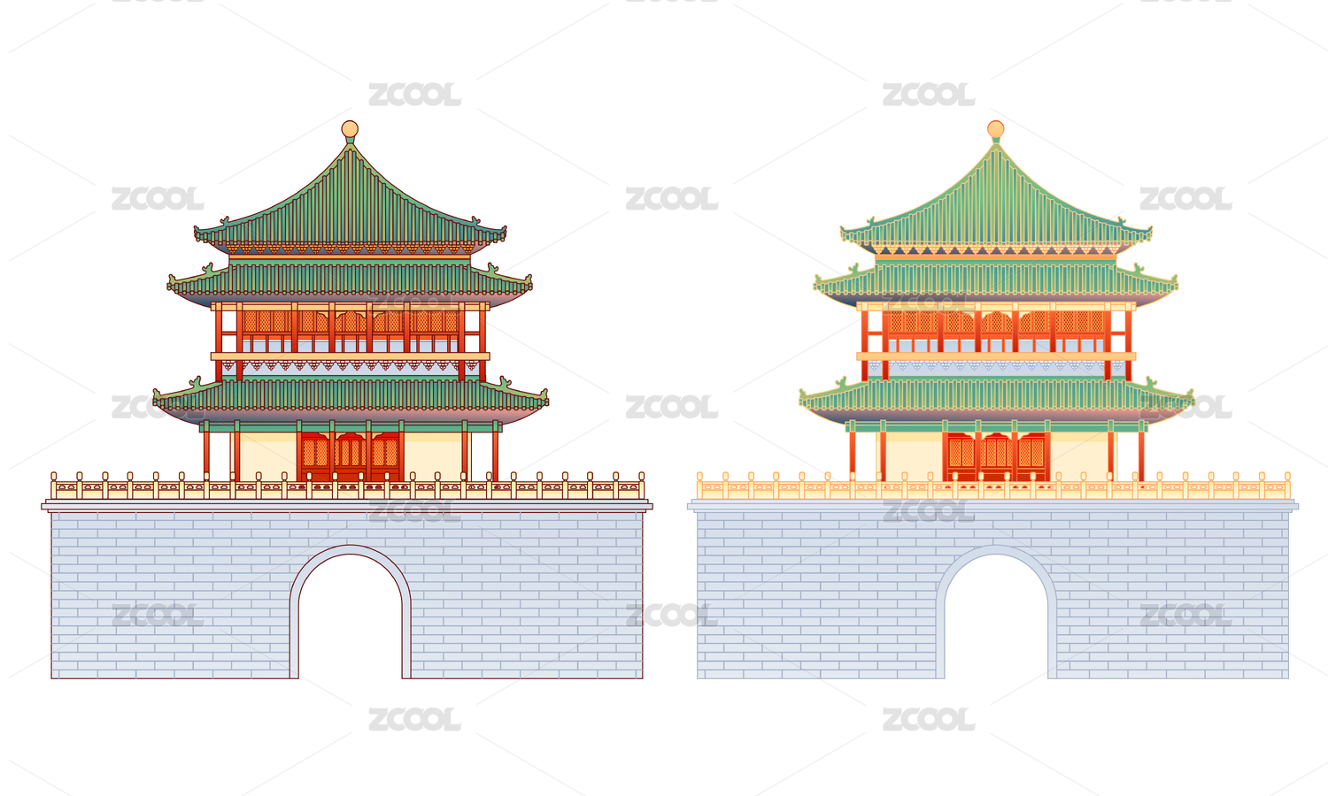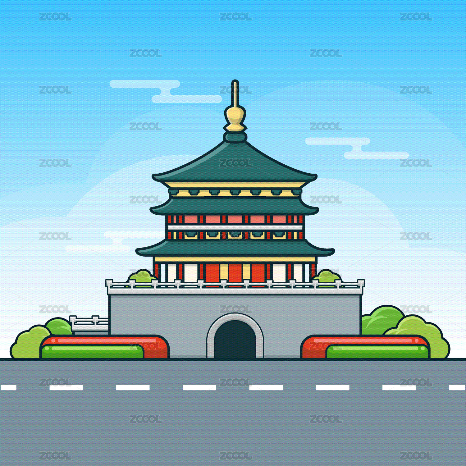 陜西西安鐘樓古建筑矢量插畫(huà)