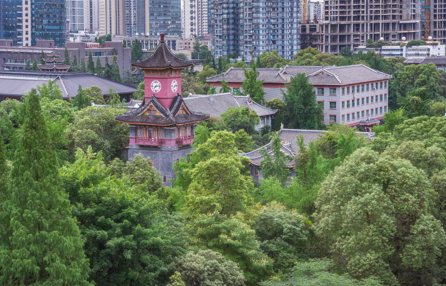 綠樹(shù)叢中的中國(guó)四川大學(xué)華西校區(qū)民國(guó)歷史建筑鐘樓
