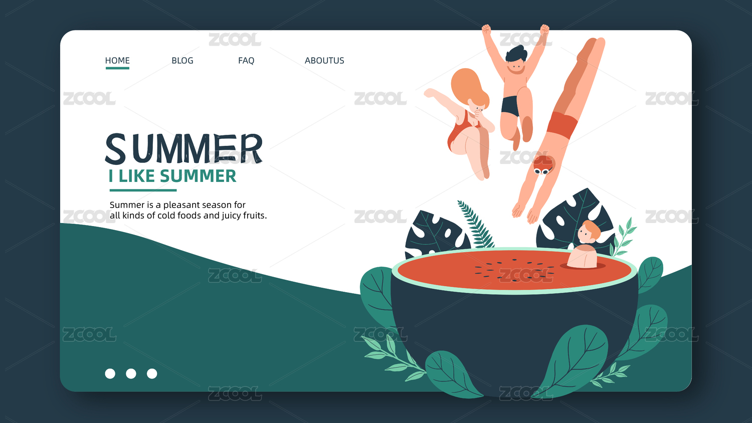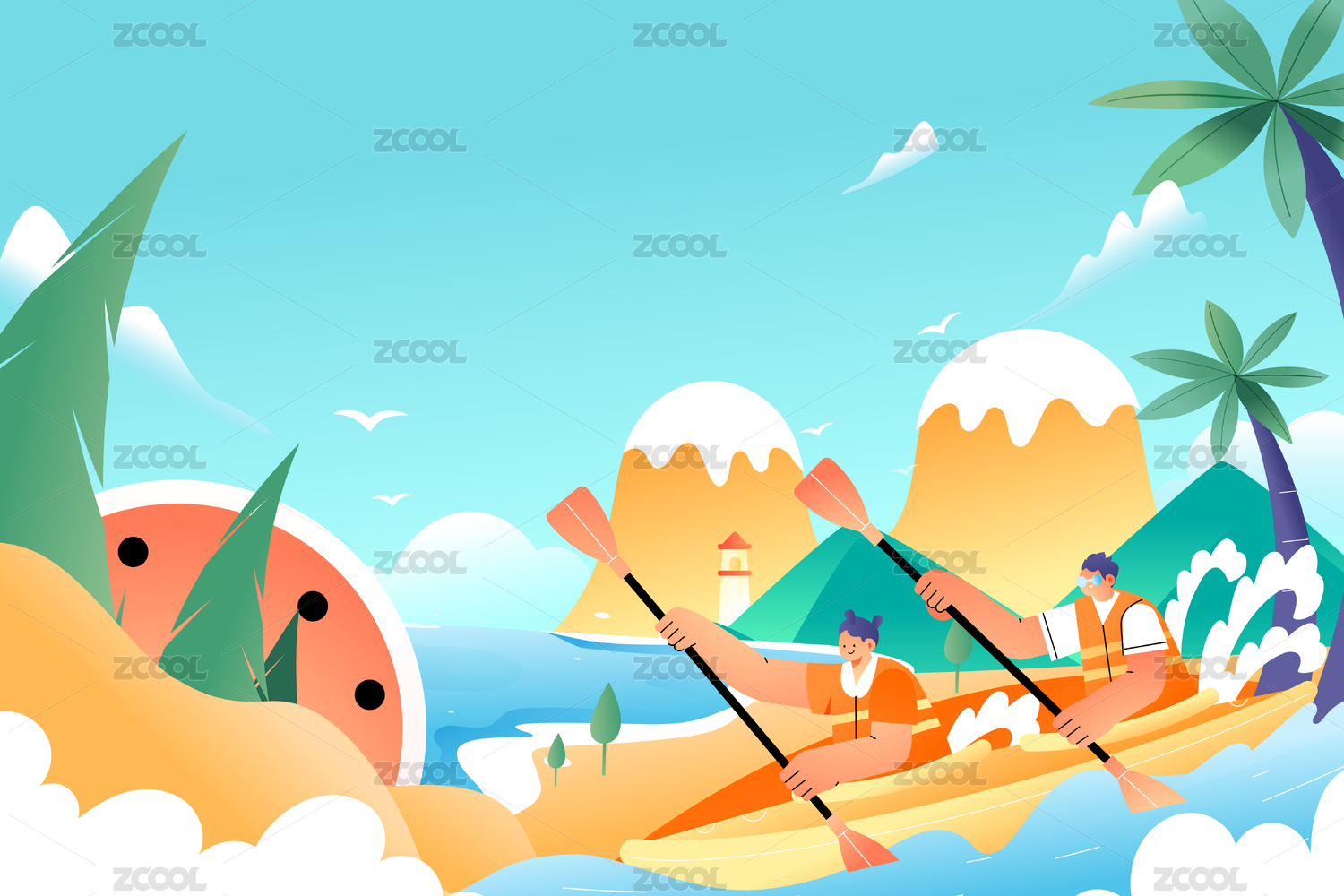 夏季主題插畫幾個(gè)男女跳入半個(gè)西瓜泳池-橫