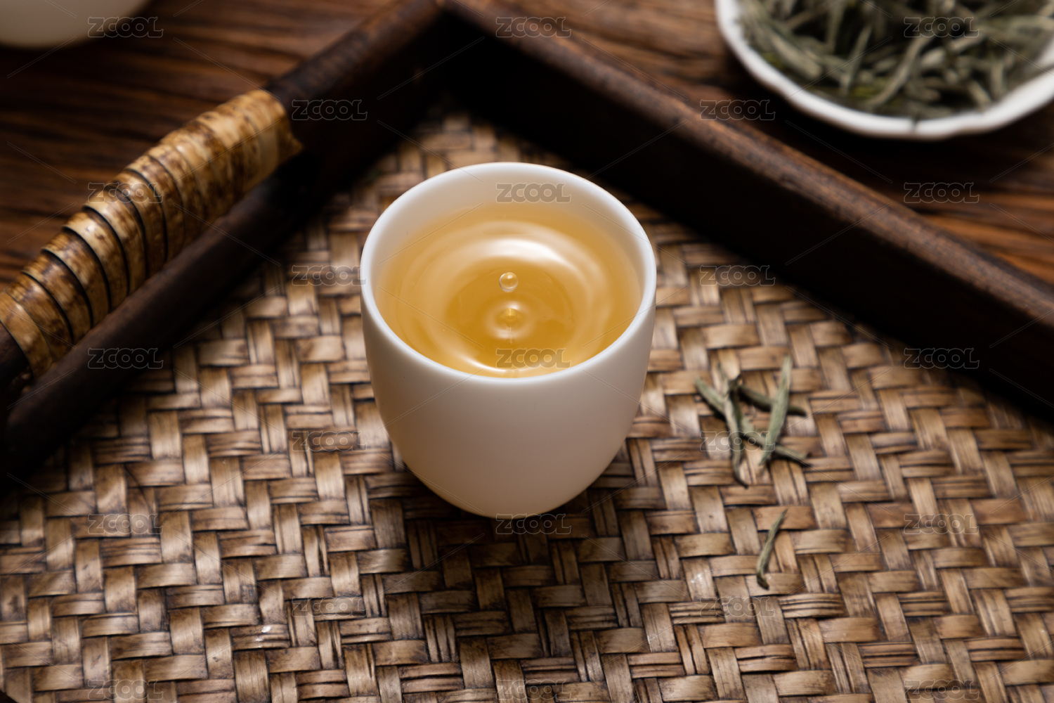 白色背景中碟子里的白茶白毫銀針
