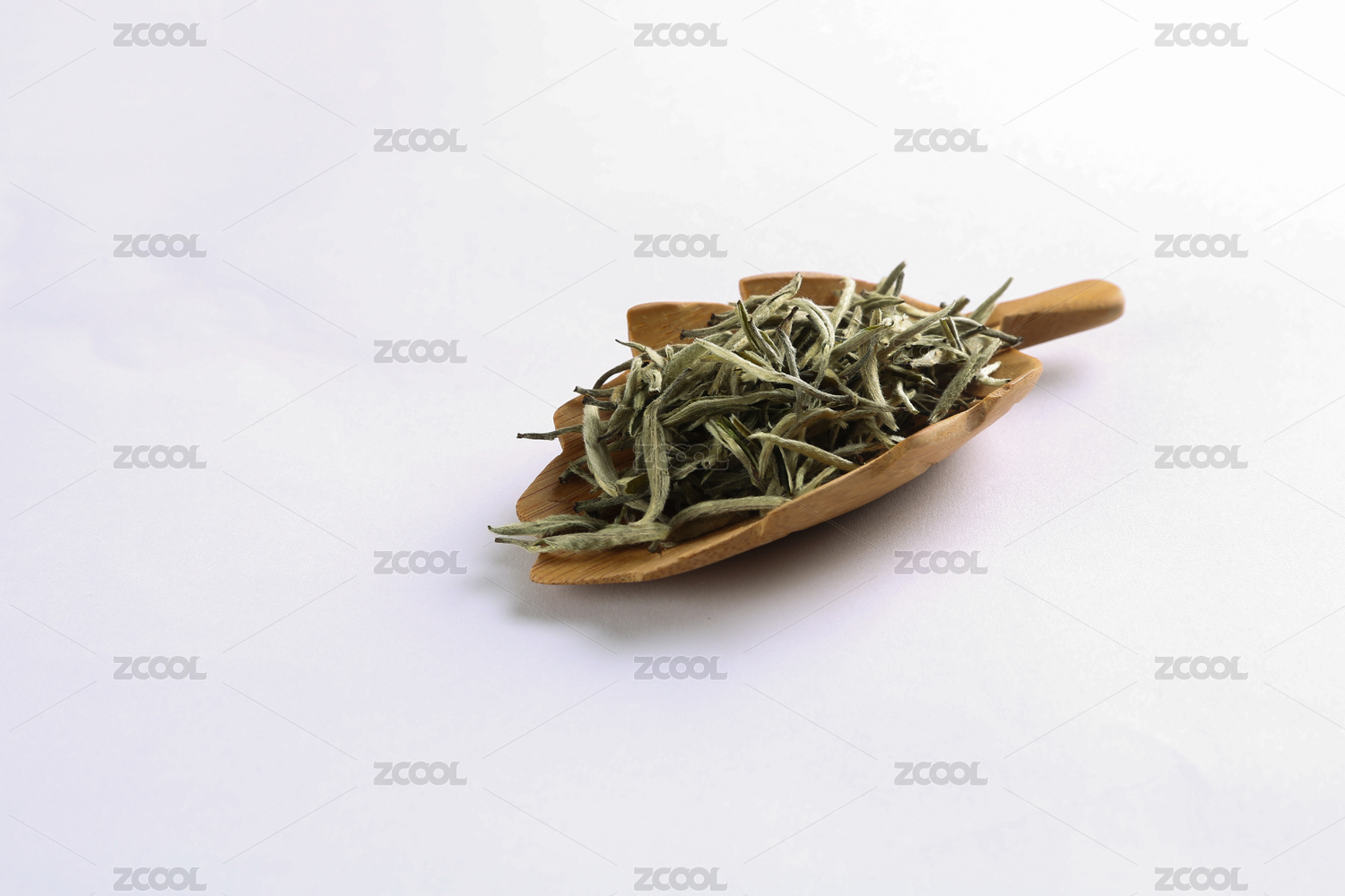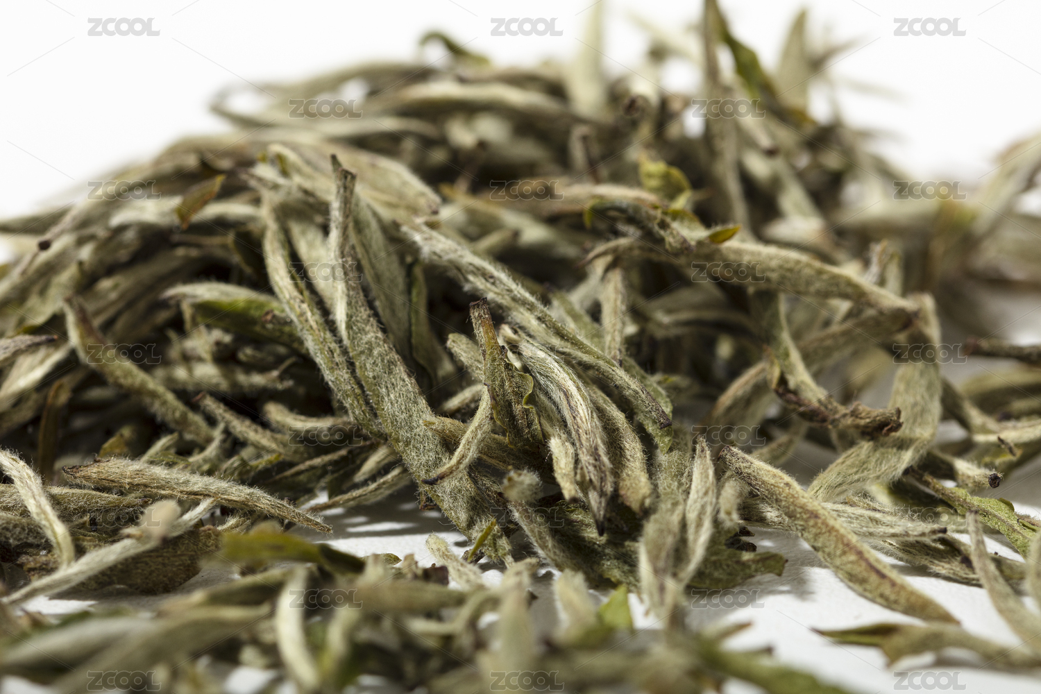 白色背景中堆放的白茶白毫銀針