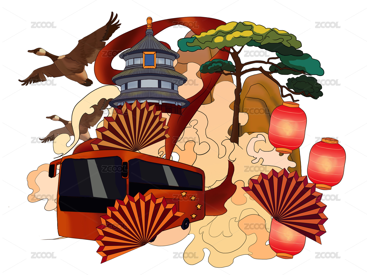 橙色國潮風(fēng)出游旅行城市故宮大雁大巴迎客