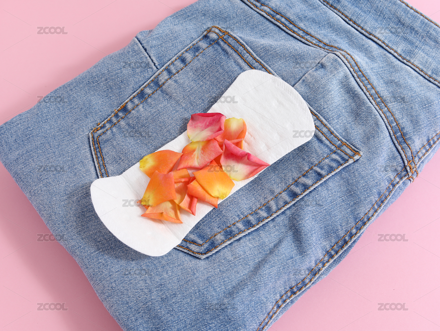 粉色背景上的褲子和女性月經用品衛(wèi)生巾