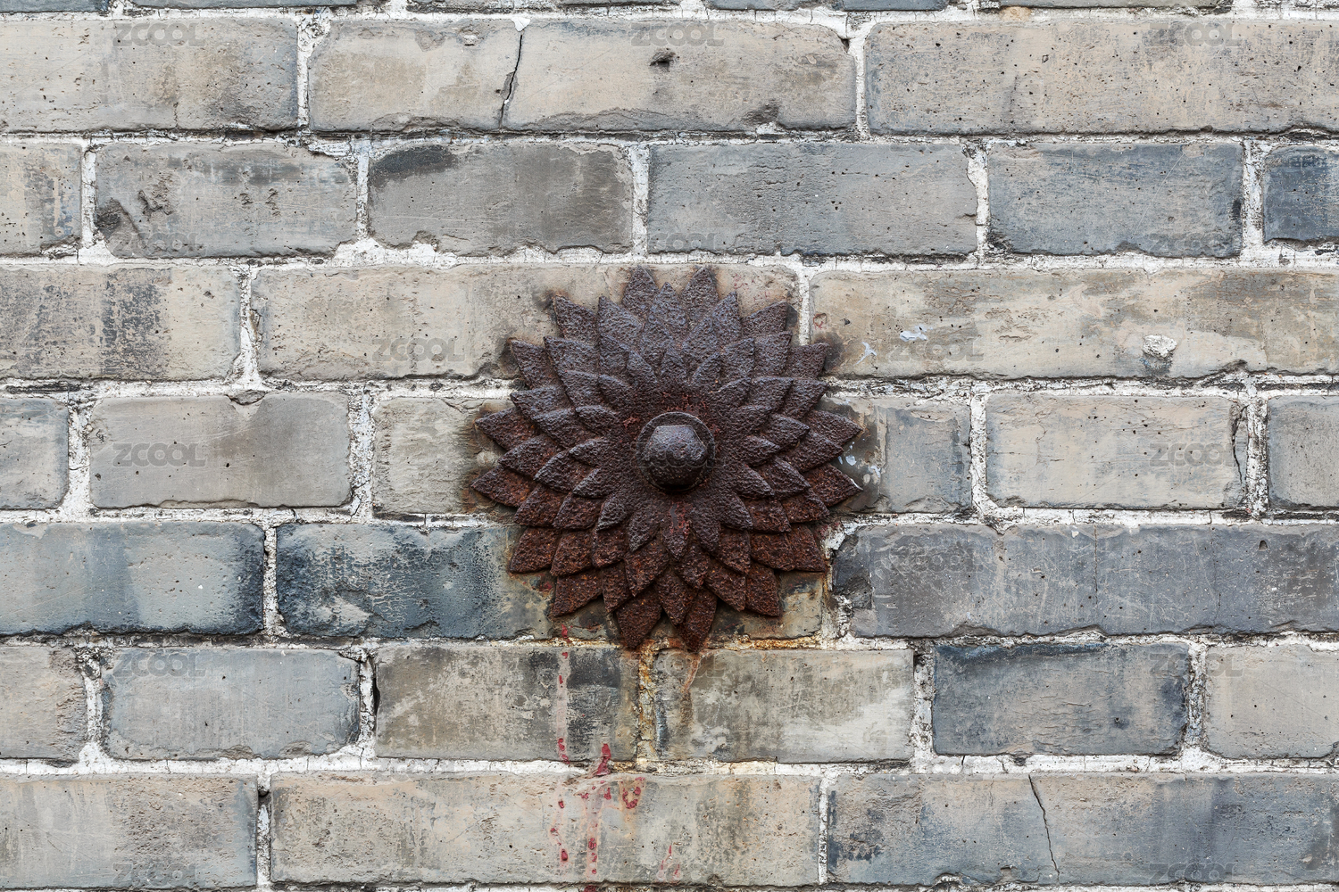 中國(guó)山西省靈石縣王家大院灰磚墻上生銹的加固用的花型構(gòu)件