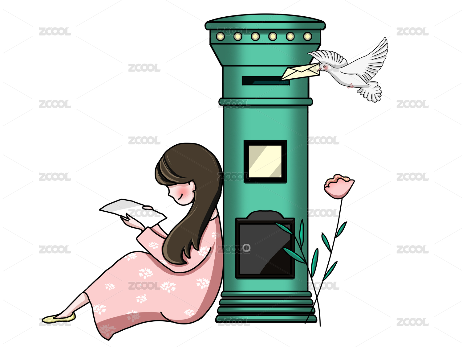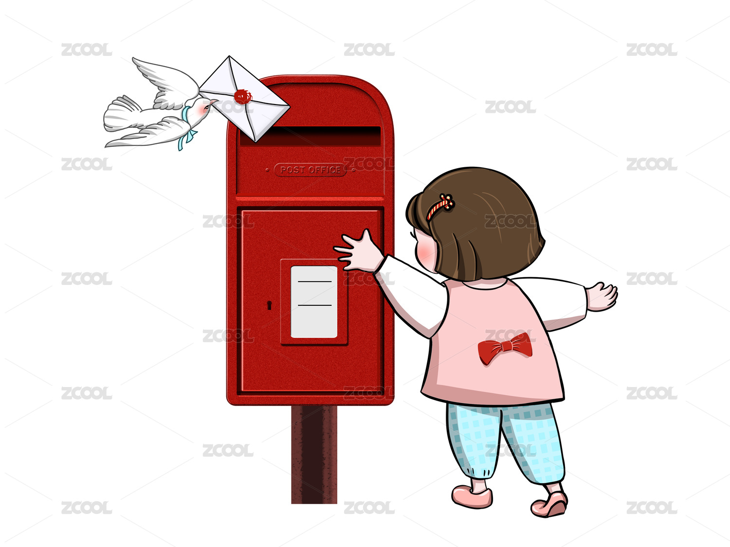 紅粉扁平風(fēng)郵政日郵筒小女孩信鴿元素