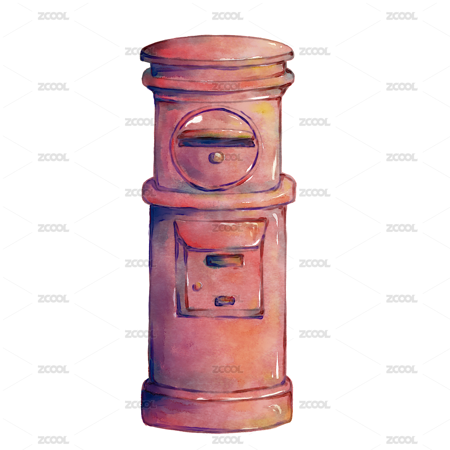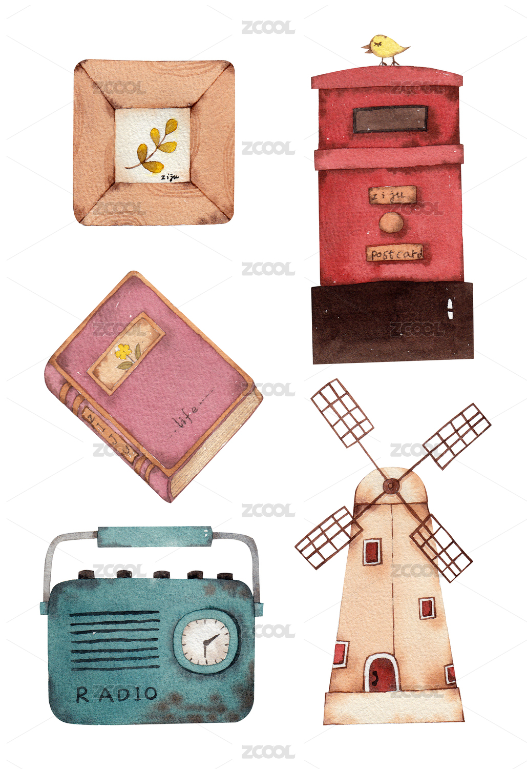 水彩手繪復(fù)古小物件擺件收音機(jī)書本郵筒