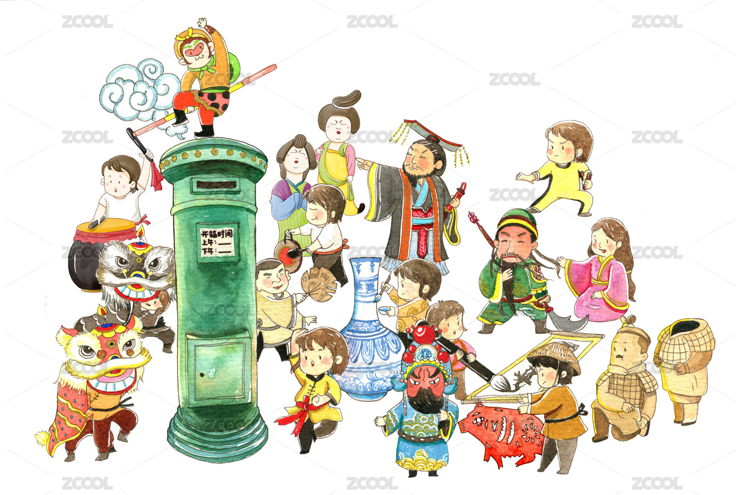 漫游城市中國(guó)郵筒中國(guó)印象舞獅功夫插畫