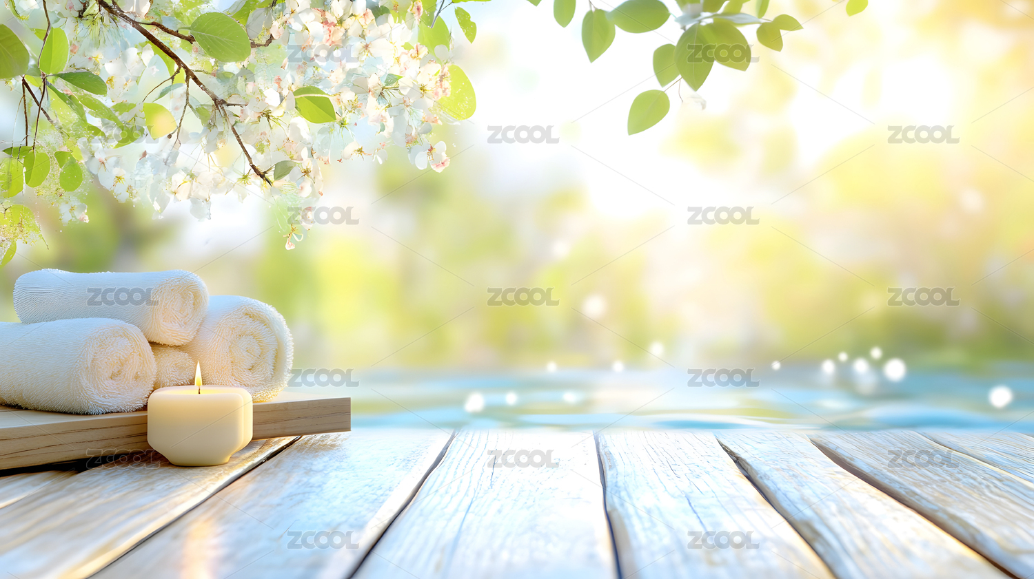 木臺(tái)上卷毛巾蠟燭與繁花景致