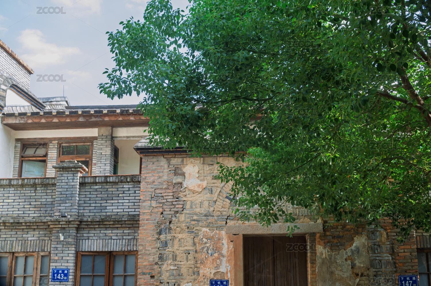 福州上下杭古樸磚瓦房旁的綠樹(shù)景致