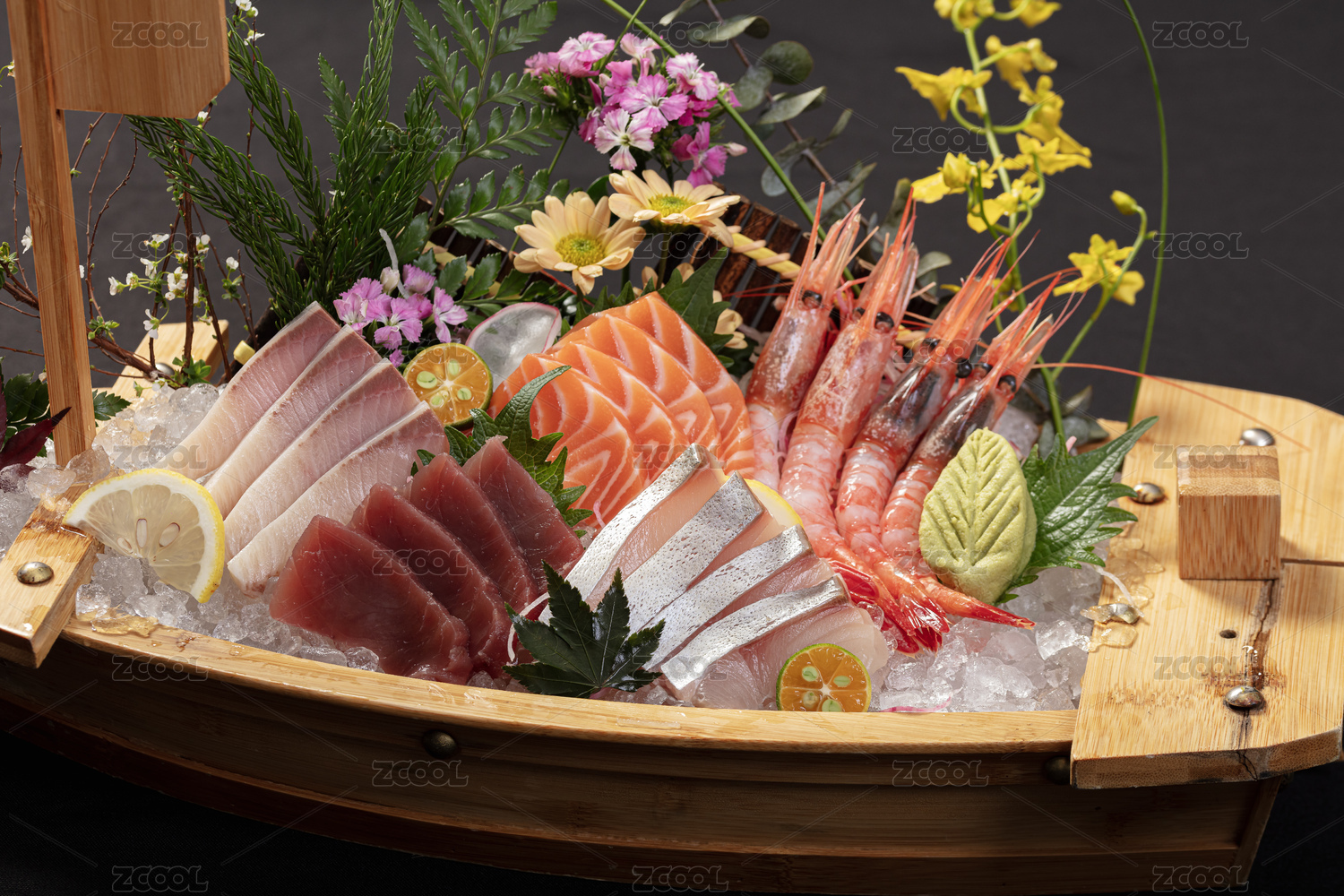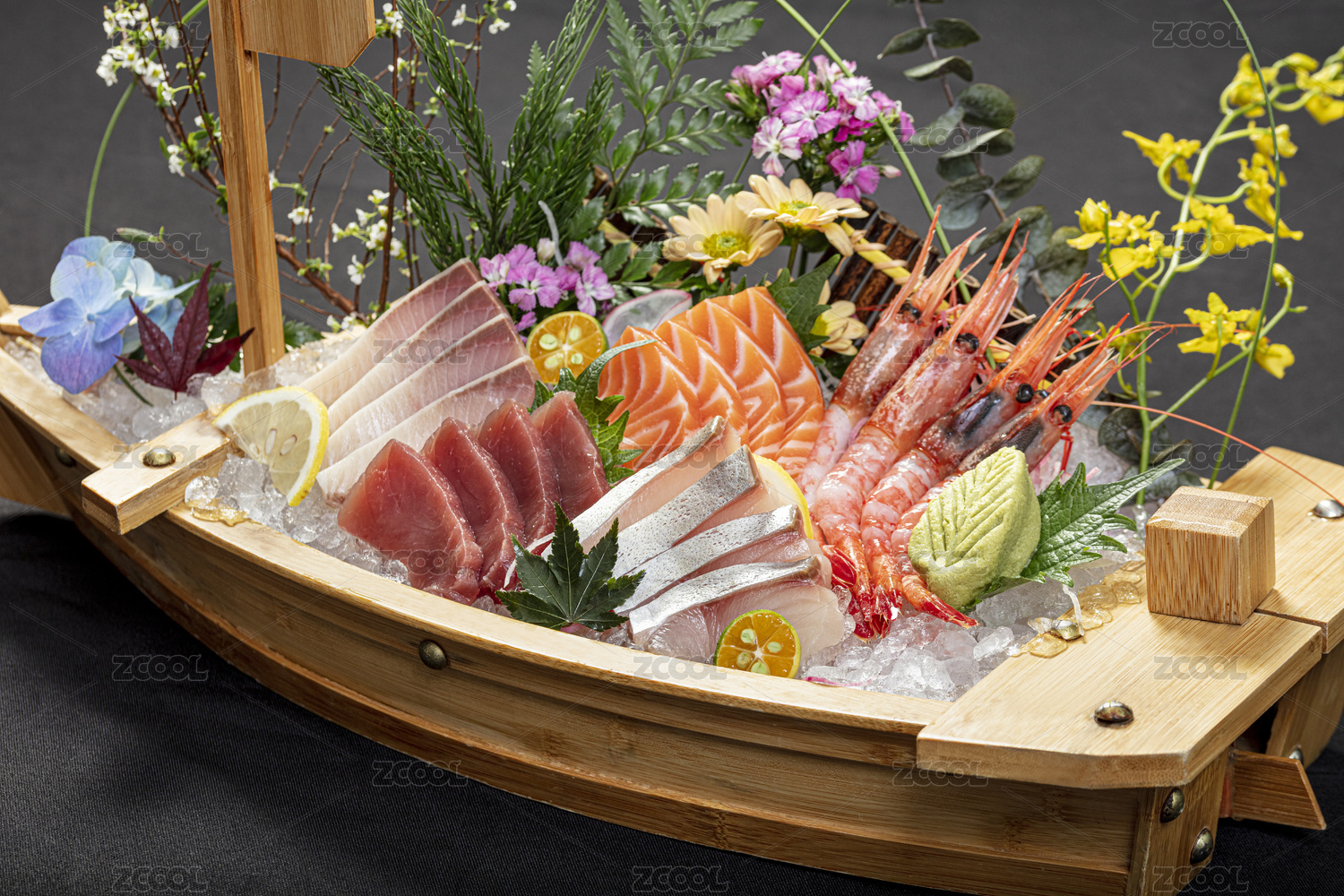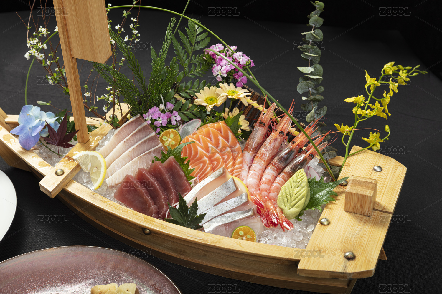 木船造型的精致生魚(yú)片刺身拼盤(pán)