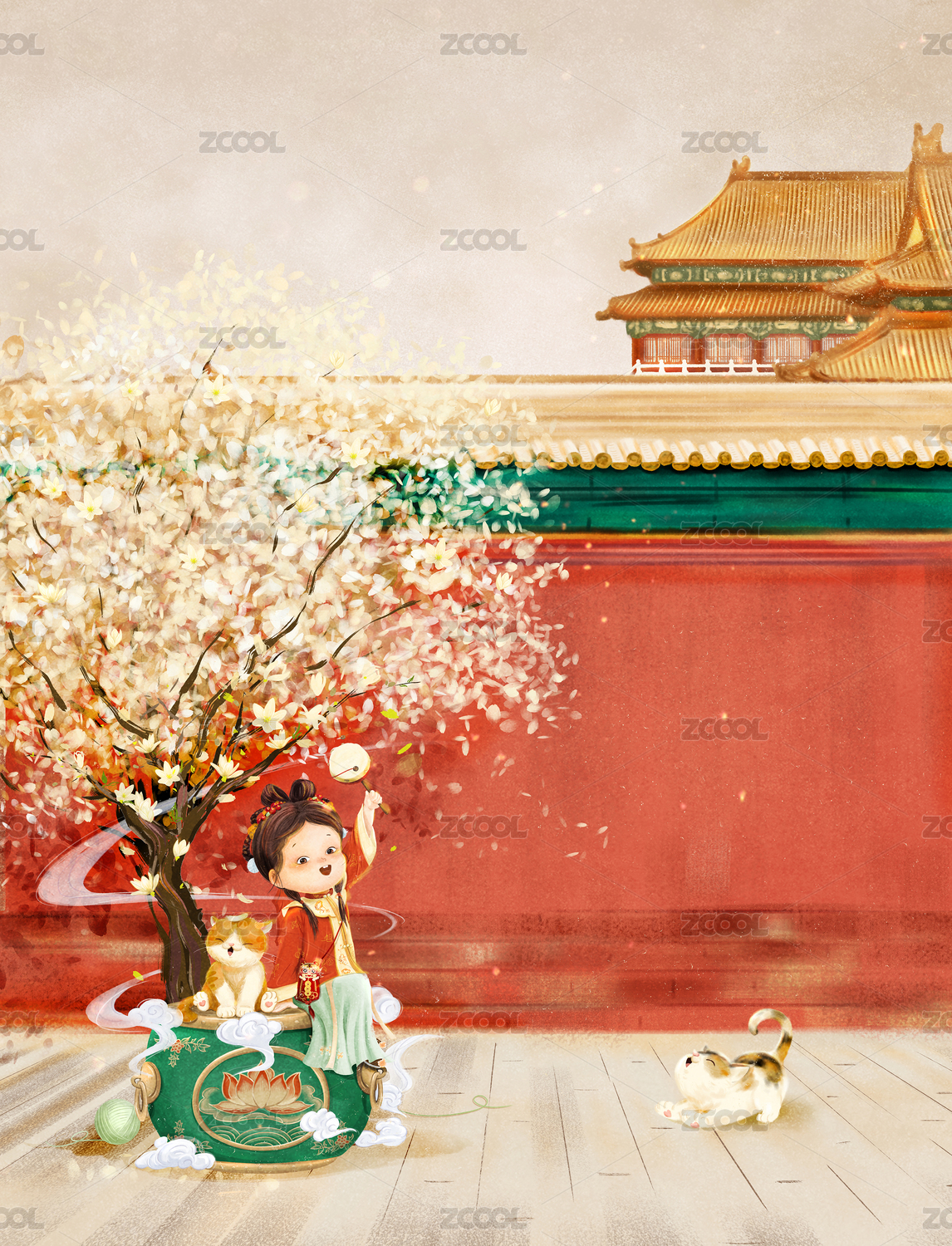 紅色背景墻前的有位侍女在看枇杷樹節(jié)氣插畫