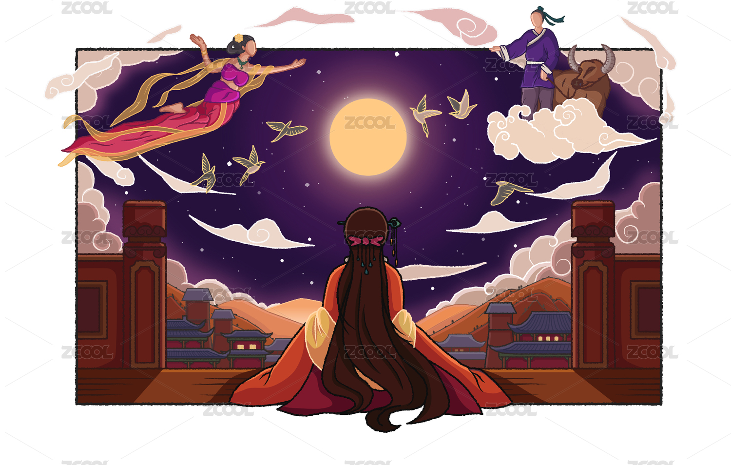 古代宮女坐在地上看天上的牛郎織女手繪插畫