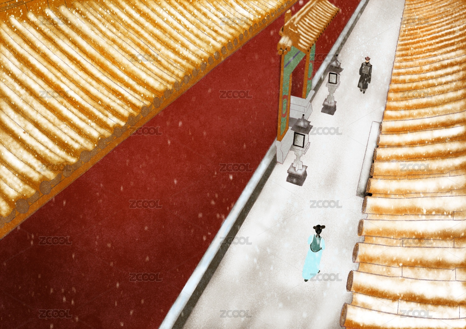 下雪天的皇宮過道上宮女和王爺迎面而行